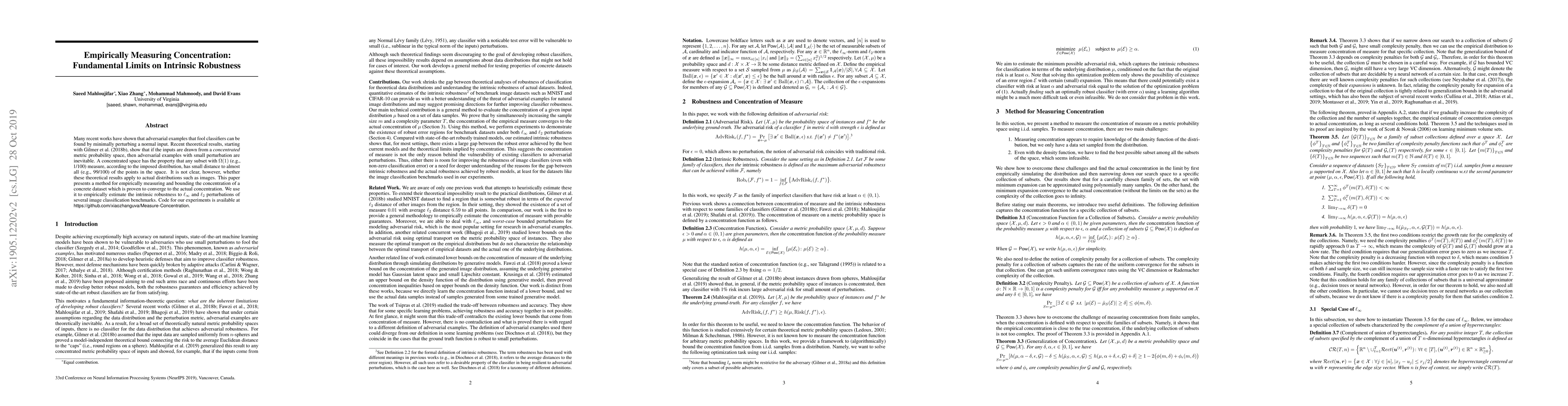 Researchers developed a method to empirically measure concentration in datasets, finding that image classification benchmarks have limited intrinsic robustness to perturbations, with most images being easily fooled by small changes.