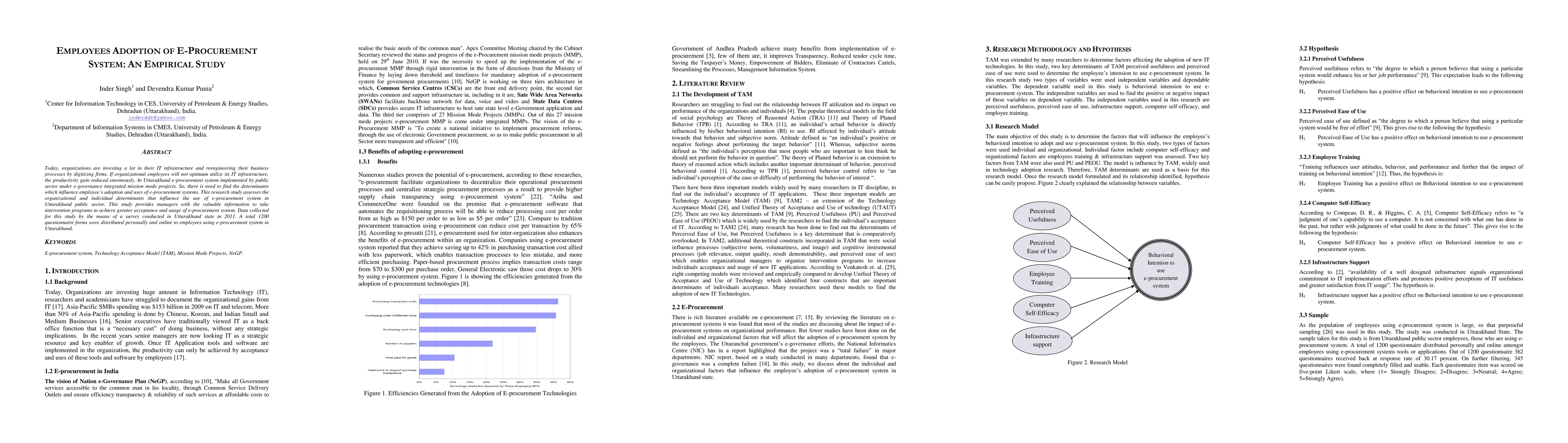 This study examines determinants of employee adoption for e-procurement systems in Uttarakhand's public sector, identifying key factors influencing usage through a 2011 survey of 1200 employees. It offers managers insights to enhance e-procurement system acceptance and implementation.