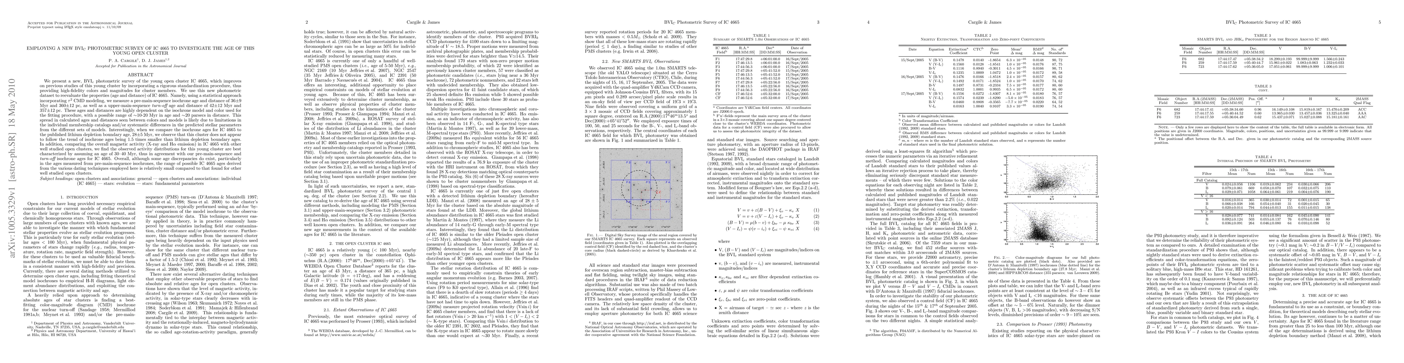 This paper presents a new BVIc photometric survey of the young open cluster IC 4665, using improved standardization to reevaluate its age and distance. The study finds an age range of 36±9 Myr to 42±12 Myr and a distance of 360±12 pc, with discrepancies likely due to model limitations and membership catalog issues.