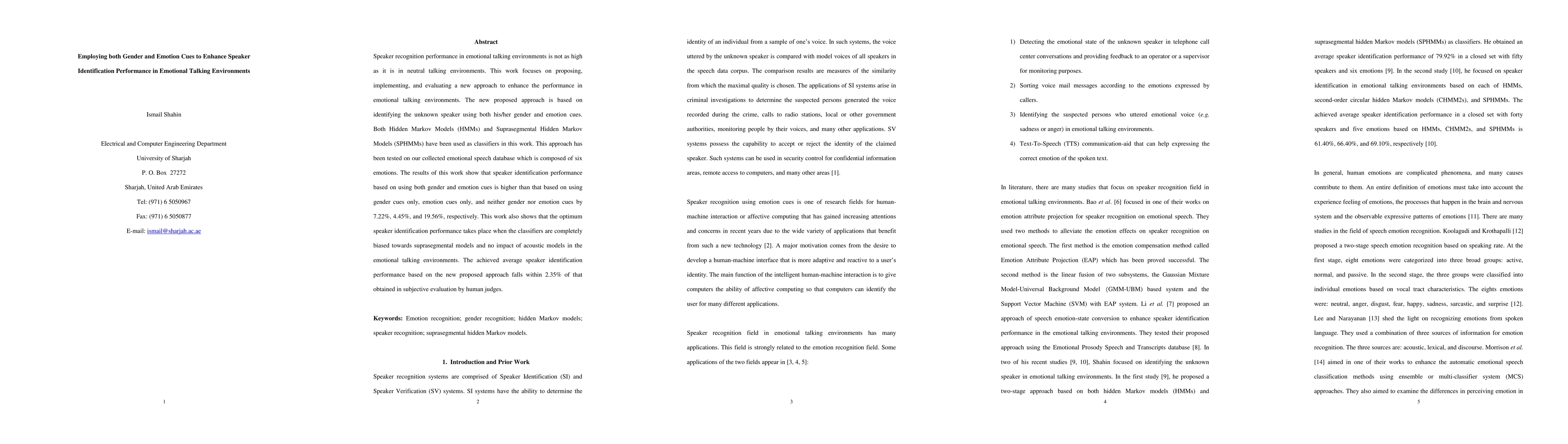 This research proposes an enhanced speaker identification method using both gender and emotion cues in emotional talking environments, achieving better results than using either cue alone or neither. The study employs HMMs and SPHMMs classifiers and demonstrates a significant improvement over traditional methods.