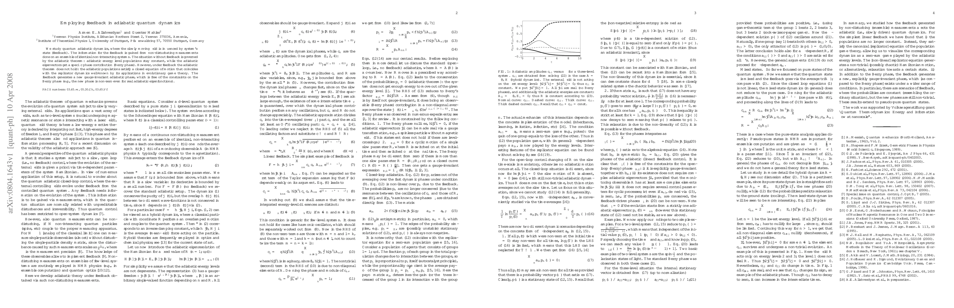 We study quantum adiabatic dynamics, where the slowly moving field is influenced by system's state (feedback). The information for the feedback is gained from non-disturbating measurements done on an ensemble of identical non-interacting systems. The situation without feedback is governed by the adiabatic theorem: adiabatic energy level populations stay constant, while the adiabatic eigenvectors get a specific phase contribution (Berry phase). However, under feedback the adiabatic theorem does not hold: the adiabatic populations satisfy a closed equation of motion that coincides with the replicator dynamics well-known by its applications in evolutionary game theory. The feedback generates a new gauge-invariant adiabatic phase, which is free of the constraints on the Berry phase (e.g., the new phase is non-zero even for real adiabatic eigenfunctions).