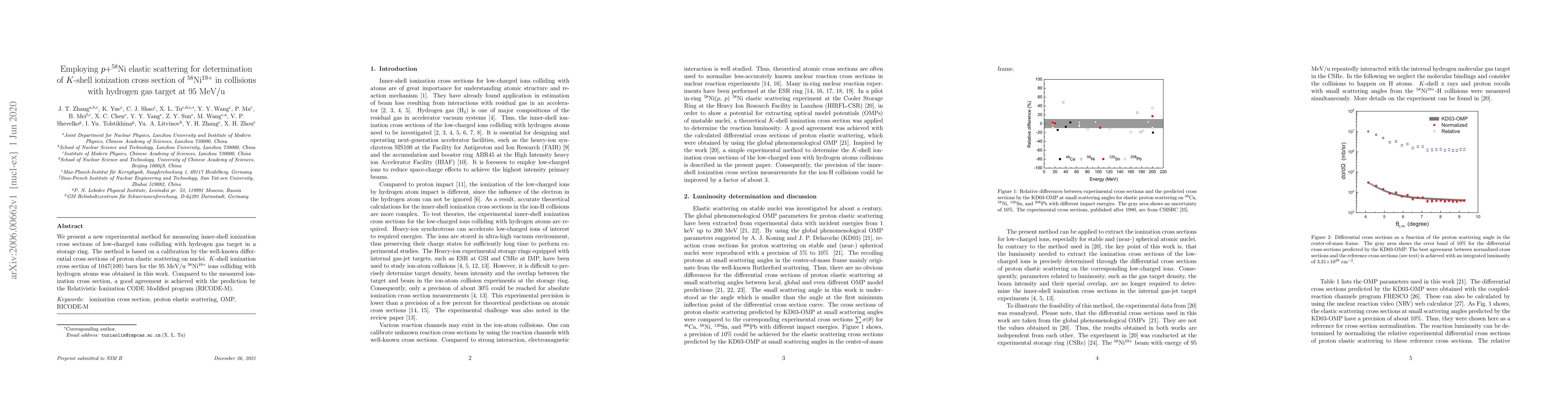We present a new experimental method for measuring inner-shell ionization cross sections of low-charged ions colliding with hydrogen gas target in a storage ring. The method is based on a calibration by the well-known differential cross sections of proton elastic scattering on nuclei. $K$-shell ionization cross section of 1047(100) barn for the 95 MeV/u $^{58}$Ni$^{19+}$ ions colliding with hydrogen atoms was obtained in this work. Compared to the measured ionization cross section, a good agreement is achieved with the prediction by the Relativistic Ionization CODE Modified program (RICODE-M).