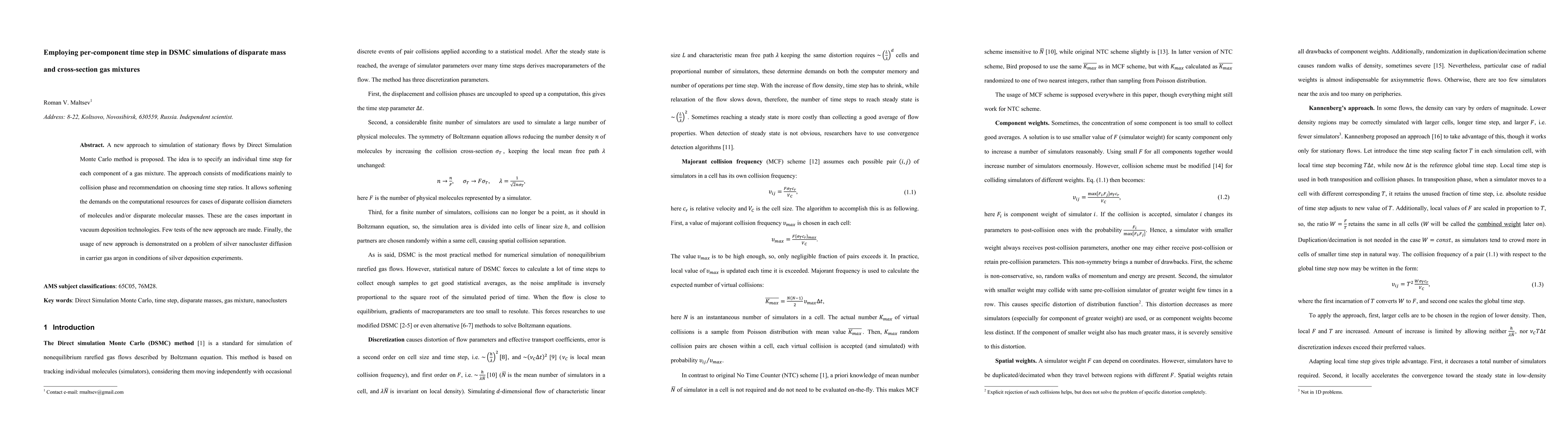 A new approach to simulation of stationary flows by Direct Simulation Monte Carlo method is proposed. The idea is to specify an individual time step for each component of a gas mixture. The approach consists of modifications mainly to collision phase and recommendation on choosing time step ratios. It allows softening the demands on the computational resources for cases of disparate collision diameters of molecules and/or disparate molecular masses. These are the cases important in vacuum deposition technologies. Few tests of the new approach are made. Finally, the usage of new approach is demonstrated on a problem of silver nanocluster diffusion in carrier gas argon in conditions of silver deposition experiments.