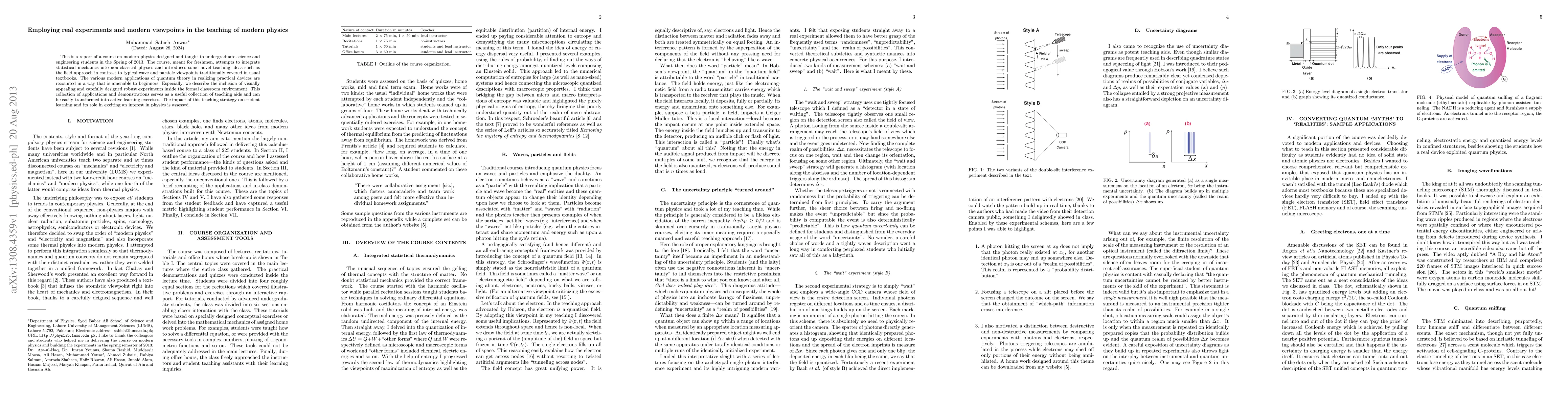 This is a report of a course on modern physics designed and taught to undergraduate science and engineering students in the Spring of 2013. The course, meant for freshmen, attempts to integrate statistical mechanics into non-classical physics and introduces some novel teaching ideas such as the field approach in contrast to typical wave and particle viewpoints traditionally covered in usual textbooks. The various modern applications of quantum theory in realizing practical devices are recounted in a way that is amenable to beginners. Especially, we describe the inclusion of visually appealing and carefully designed robust experiments inside the formal classroom environment. This collection of applications and demonstrations serves as a useful collection of teaching aids and can be easily transformed into active learning exercises. The impact of this teaching strategy on student learning and its role in exciting an interest in physics is assessed.