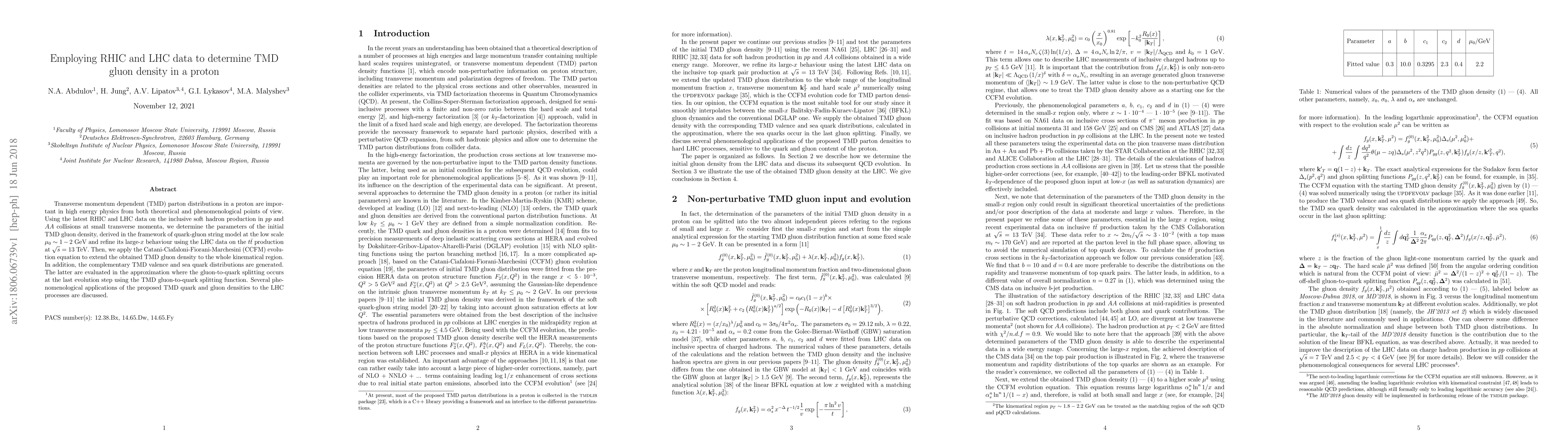 This paper utilizes RHIC and LHC data to determine the Transverse Momentum Dependent (TMD) gluon density in a proton, employing the quark-gluon string model and the CCFM evolution equation for comprehensive analysis. The refined gluon density and complementary TMD quark distributions are applied to various LHC processes.