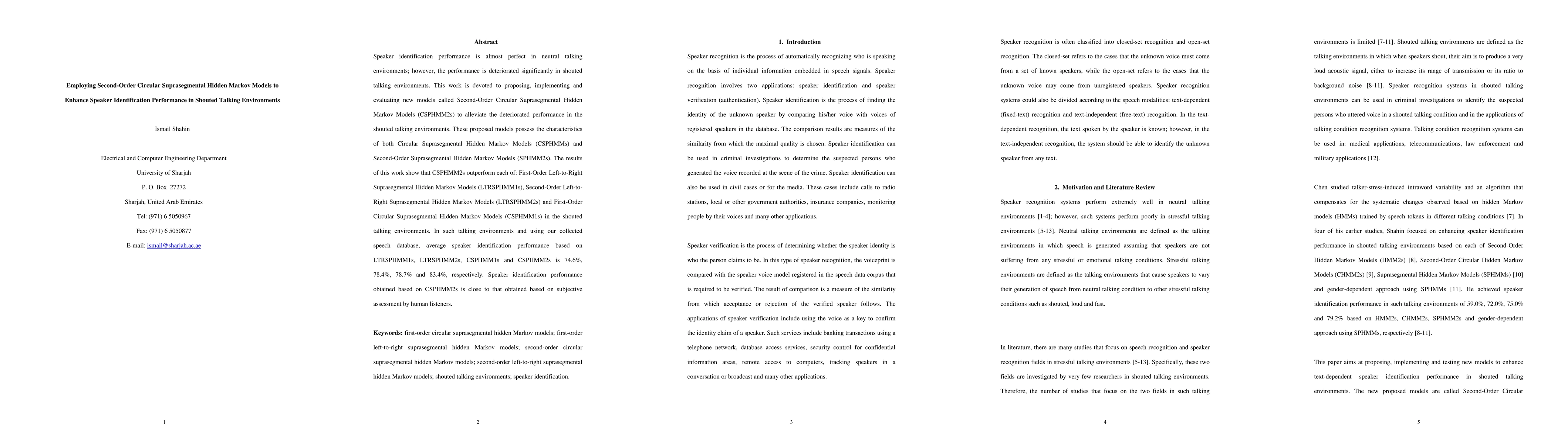 This paper proposes Second-Order Circular Suprasegmental Hidden Markov Models (CSPHMM2s) to enhance speaker identification in shouted talking environments, achieving superior performance compared to other models. CSPHMM2s outperform traditional models, with an average identification rate of 83.4% in shouted environments.