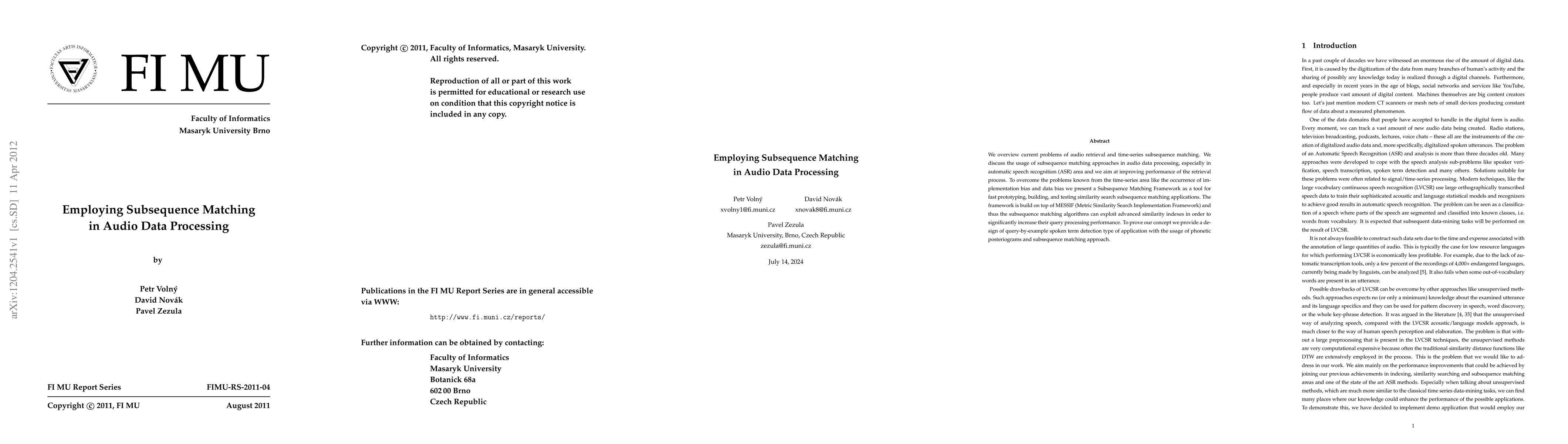 This paper discusses the application of subsequence matching in audio data processing, particularly for automatic speech recognition, aiming to enhance retrieval performance. It introduces a Subsequence Matching Framework built on MESSIF to address implementation and data biases, demonstrating its effectiveness through a spoken term detection application using phonetic posteriograms.