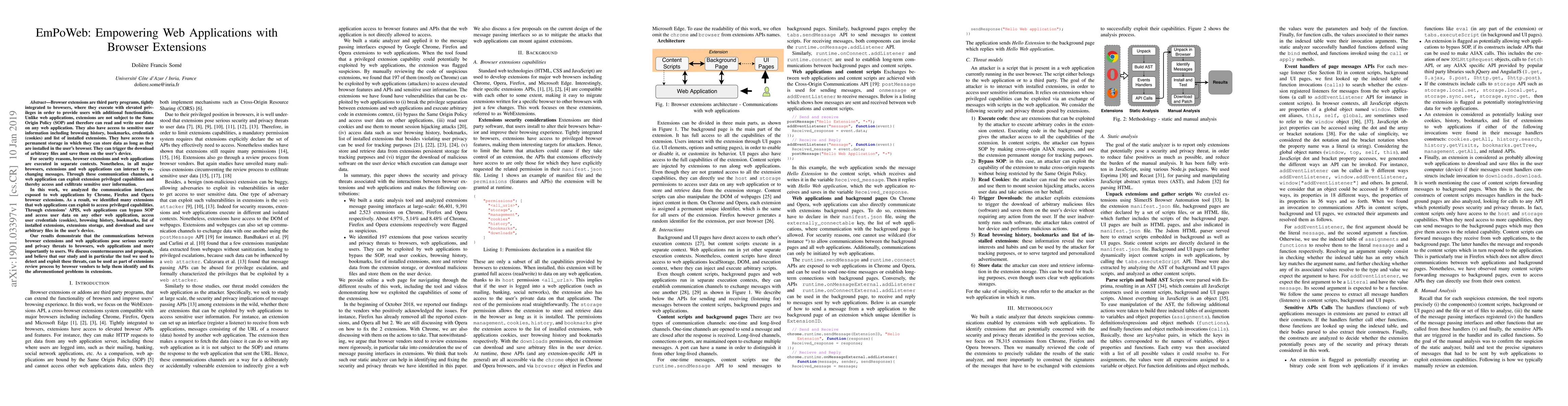 This paper analyzes how browser extensions can be exploited by web applications to bypass security policies, access sensitive user data, and download arbitrary files. It identifies communication interfaces in Chrome, Firefox, and Opera that enable such exploitation, highlighting significant security and privacy threats to users. The study proposes countermeasures and suggests its findings can aid browser vendors in reviewing extensions for vulnerabilities.