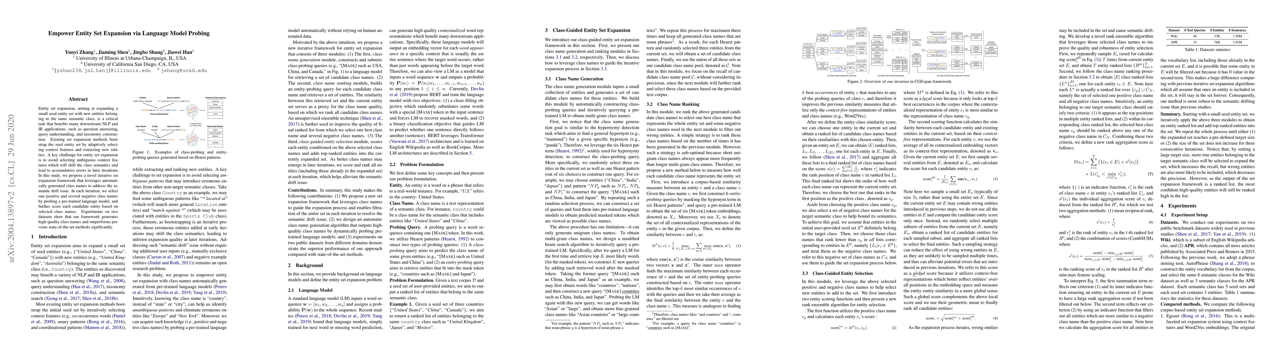 This paper proposes an iterative entity set expansion framework that leverages language model probing to generate class names, addressing semantic drift and improving the accuracy of new entity selection. Experiments demonstrate that the method outperforms existing approaches on two datasets.