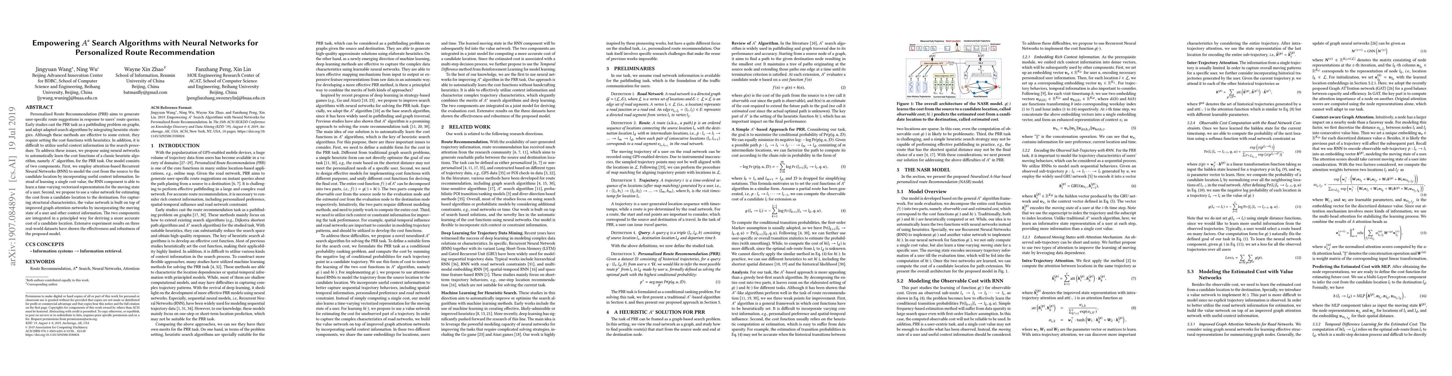 This paper proposes using neural networks to enhance the A* search algorithm for personalized route recommendations, employing RNNs to model dynamic user context and graph attention networks to capture structural characteristics, achieving more accurate and robust route suggestions. Experiments on real-world datasets demonstrate the model's effectiveness.
