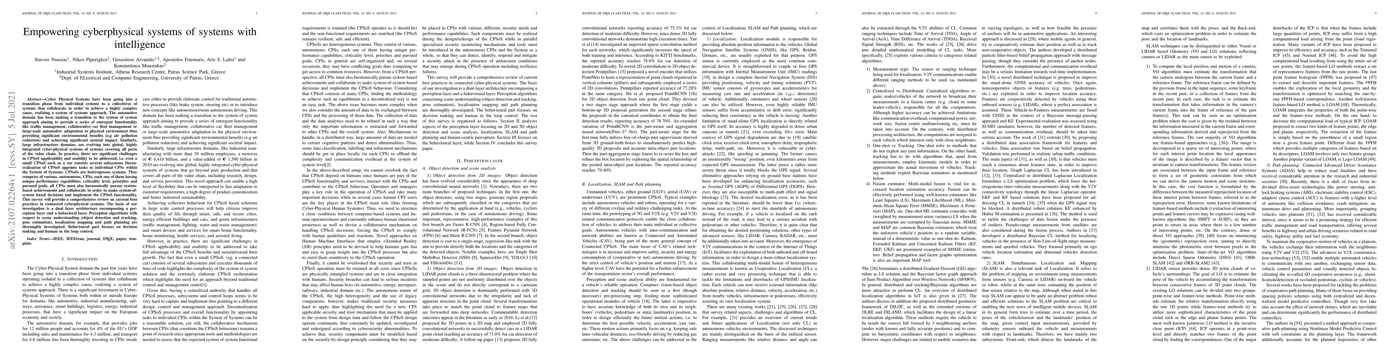 Cyber Physical Systems have been going into a transition phase from individual systems to a collecttives of systems that collaborate in order to achieve a highly complex cause, realizing a system of systems approach. The automotive domain has been making a transition to the system of system approach aiming to provide a series of emergent functionality like traffic management, collaborative car fleet management or large-scale automotive adaptation to physical environment thus providing significant environmental benefits (e.g air pollution reduction) and achieving significant societal impact. Similarly, large infrastructure domains, are evolving into global, highly integrated cyber-physical systems of systems covering all parts of the value chain. In practice, there are significant challenges in CPSoS applicability and usability to be addressed, i.e. even a small CPSoS such as a car consists several subsystems Decentralization of CPSoS appoints tasks to individual CPSs within the System of Systems. CPSoSs are heterogenous systems. They comprise of various, autonomous, CPSs, each one of them having unique performance capabilities, criticality level, priorities and pursued goals. all CPSs must also harmonically pursue system-based achievements and collaborate in order to make system-of-system based decisions and implement the CPSoS functionality. This survey will provide a comprehensive review on current best practices in connected cyberphysical systems. The basis of our investigation is a dual layer architecture encompassing a perception layer and a behavioral layer. Perception algorithms with respect to scene understanding (object detection and tracking, pose estimation), localization mapping and path planning are thoroughly investigated. Behavioural part focuses on decision making and human in the loop control.
