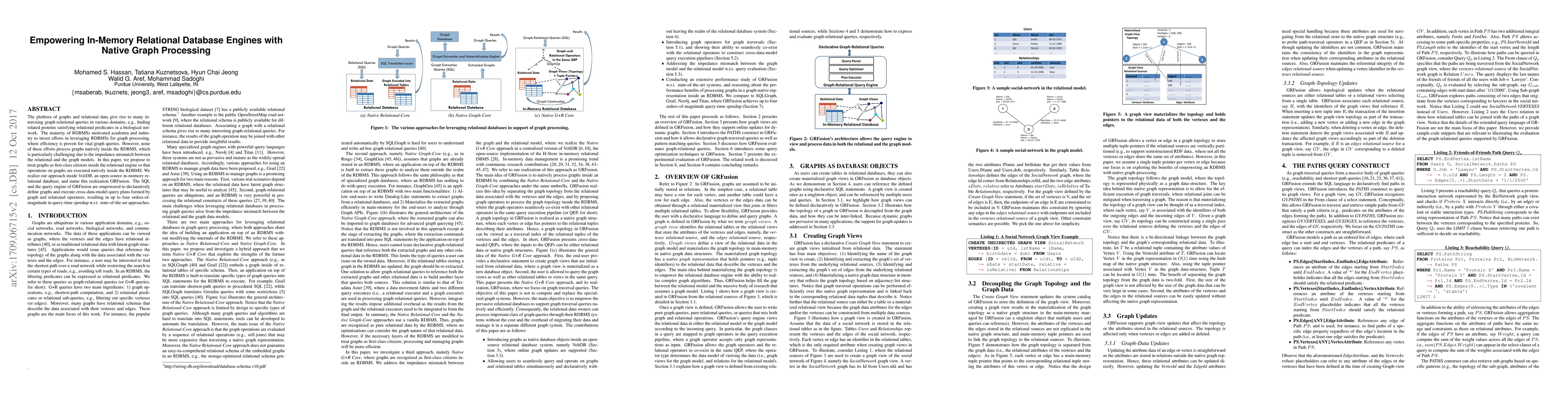 This paper proposes GRFusion, an approach to integrate native graph processing within an in-memory relational database engine, specifically VoltDB. By treating graphs as first-class entities, GRFusion enables efficient execution of graph-relational queries, achieving significant speedups compared to existing methods.