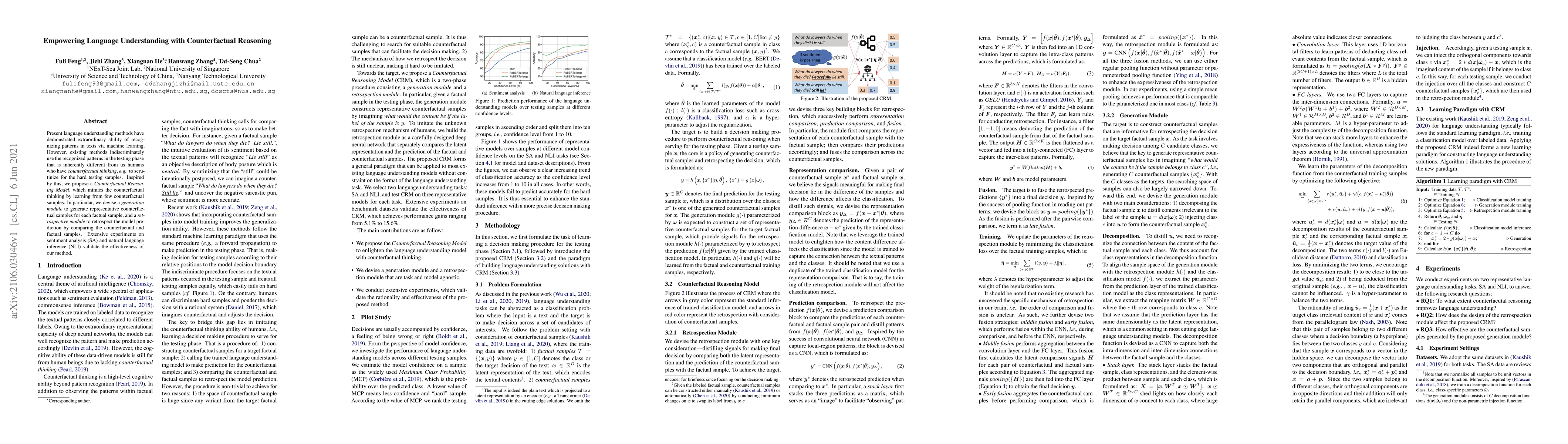 This paper proposes a Counterfactual Reasoning Model to enhance language understanding by mimicking human counterfactual thinking. The model generates counterfactual samples and uses them to improve predictions, validated through sentiment analysis and natural language inference tasks.
