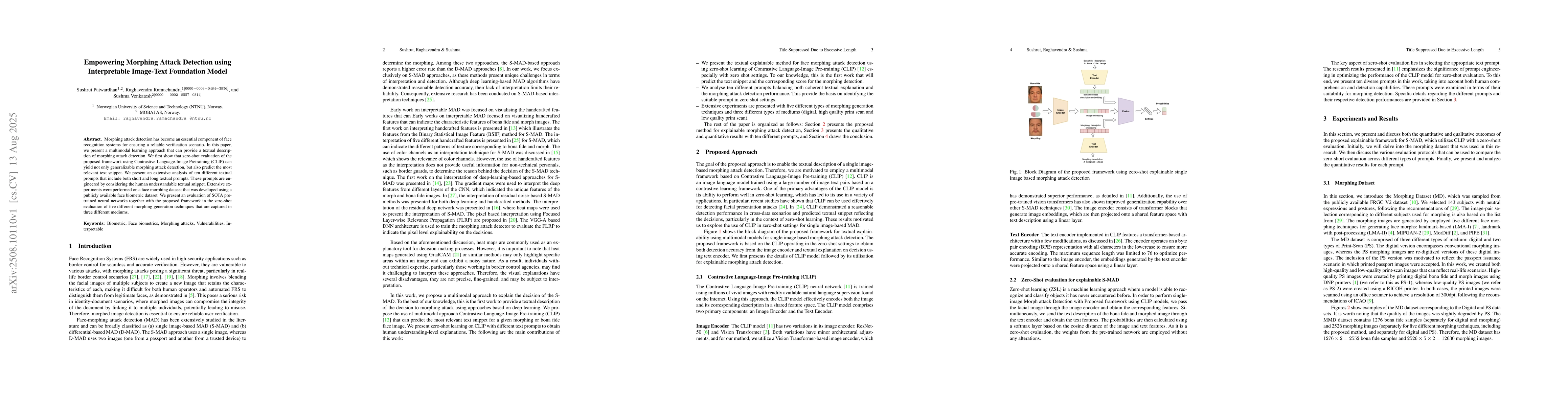 Morphing attack detection has become an essential component of face recognition systems for ensuring a reliable verification scenario. In this paper, we present a multimodal learning approach that can provide a textual description of morphing attack detection. We first show that zero-shot evaluation of the proposed framework using Contrastive Language-Image Pretraining (CLIP) can yield not only generalizable morphing attack detection, but also predict the most relevant text snippet. We present an extensive analysis of ten different textual prompts that include both short and long textual prompts. These prompts are engineered by considering the human understandable textual snippet. Extensive experiments were performed on a face morphing dataset that was developed using a publicly available face biometric dataset. We present an evaluation of SOTA pre-trained neural networks together with the proposed framework in the zero-shot evaluation of five different morphing generation techniques that are captured in three different mediums.
