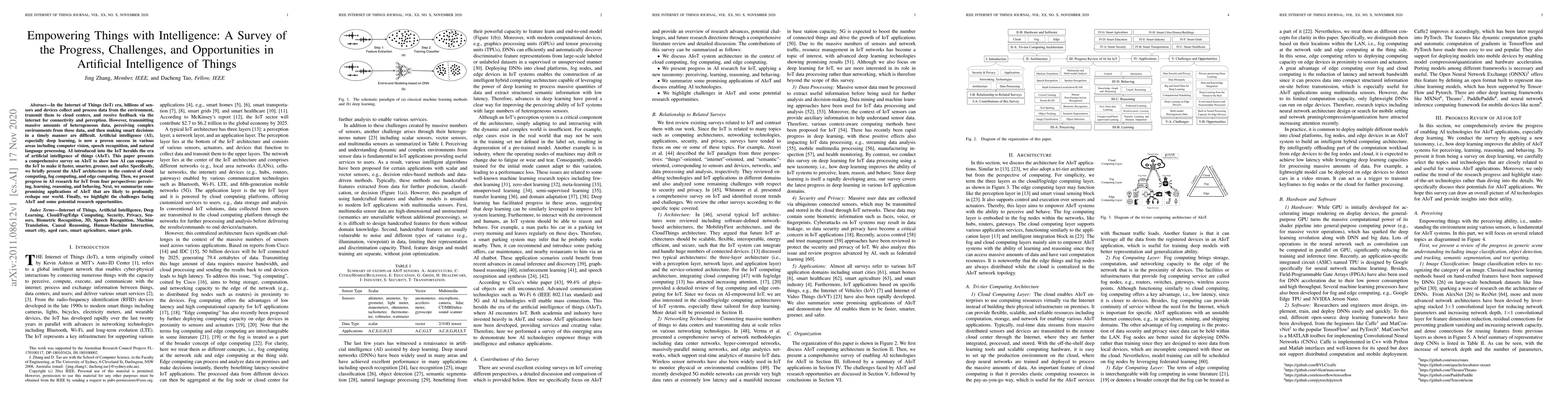 In the Internet of Things (IoT) era, billions of sensors and devices collect and process data from the environment, transmit them to cloud centers, and receive feedback via the internet for connectivity and perception. However, transmitting massive amounts of heterogeneous data, perceiving complex environments from these data, and then making smart decisions in a timely manner are difficult. Artificial intelligence (AI), especially deep learning, is now a proven success in various areas including computer vision, speech recognition, and natural language processing. AI introduced into the IoT heralds the era of artificial intelligence of things (AIoT). This paper presents a comprehensive survey on AIoT to show how AI can empower the IoT to make it faster, smarter, greener, and safer. Specifically, we briefly present the AIoT architecture in the context of cloud computing, fog computing, and edge computing. Then, we present progress in AI research for IoT from four perspectives: perceiving, learning, reasoning, and behaving. Next, we summarize some promising applications of AIoT that are likely to profoundly reshape our world. Finally, we highlight the challenges facing AIoT and some potential research opportunities.