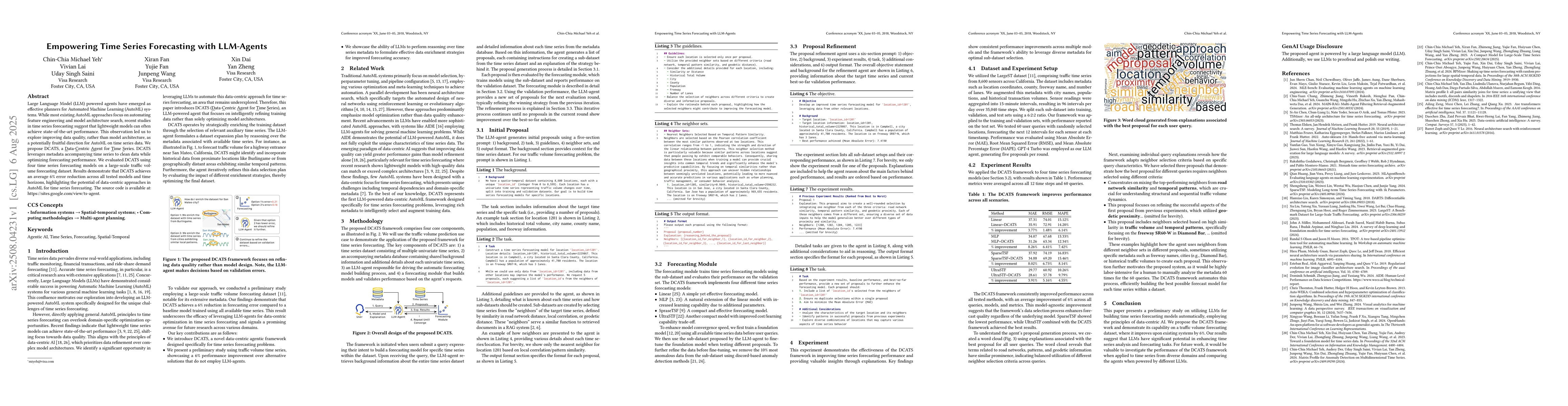 Large Language Model (LLM) powered agents have emerged as effective planners for Automated Machine Learning (AutoML) systems. While most existing AutoML approaches focus on automating feature engineering and model architecture search, recent studies in time series forecasting suggest that lightweight models can often achieve state-of-the-art performance. This observation led us to explore improving data quality, rather than model architecture, as a potentially fruitful direction for AutoML on time series data. We propose DCATS, a Data-Centric Agent for Time Series. DCATS leverages metadata accompanying time series to clean data while optimizing forecasting performance. We evaluated DCATS using four time series forecasting models on a large-scale traffic volume forecasting dataset. Results demonstrate that DCATS achieves an average 6% error reduction across all tested models and time horizons, highlighting the potential of data-centric approaches in AutoML for time series forecasting.