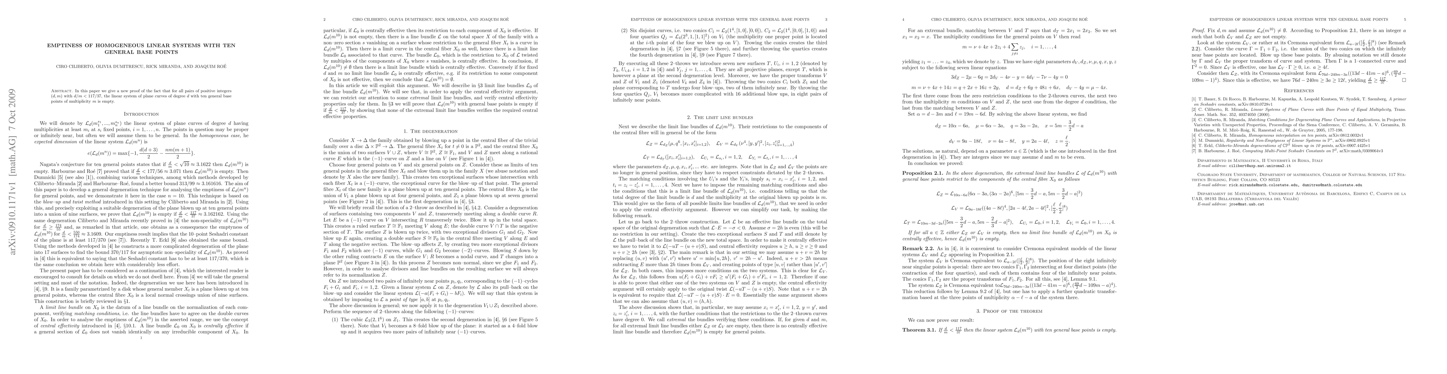 In this paper we give a new proof of the fact that for all pairs of positive integers (d, m) with d/m < 117/37, the linear system of plane curves of degree d with ten general base points of multiplicity m is empty.