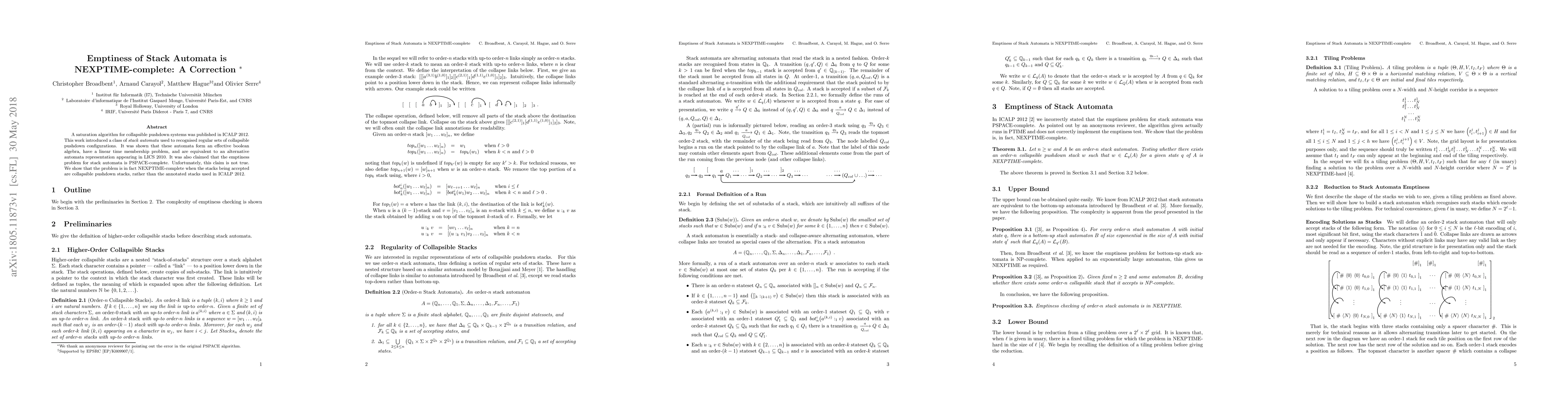 A saturation algorithm for collapsible pushdown systems was published in ICALP 2012. This work introduced a class of stack automata used to recognised regular sets of collapsible pushdown configurations. It was shown that these automata form an effective boolean algebra, have a linear time membership problem, and are equivalent to an alternative automata representation appearing in LICS 2010. It was also claimed that the emptiness problem for stack automata is PSPACE-complete. Unfortunately, this claim is not true. We show that the problem is in fact NEXPTIME-complete when the stacks being accepted are collapsible pushdown stacks, rather than the annotated stacks used in ICALP 2012.