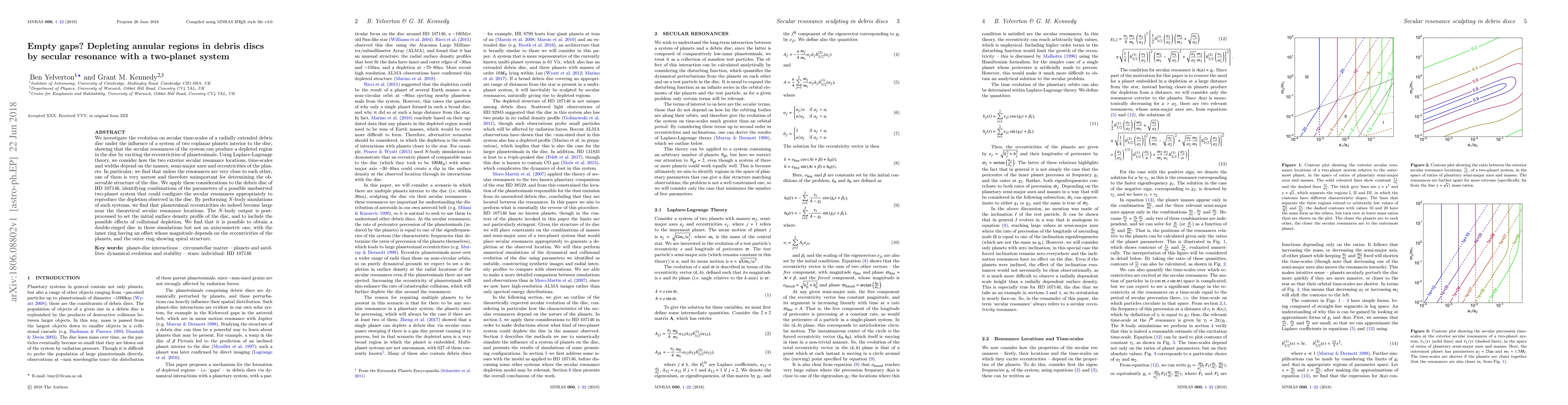 This paper explores how secular resonances between two interior planets can create depleted regions in a debris disc by exciting planetesimal eccentricities. It finds that only closely spaced resonances significantly affect the disc's structure, and applies these findings to model the observed depletion in HD 107146's debris disc, predicting a double-ringed structure with an offset inner ring.