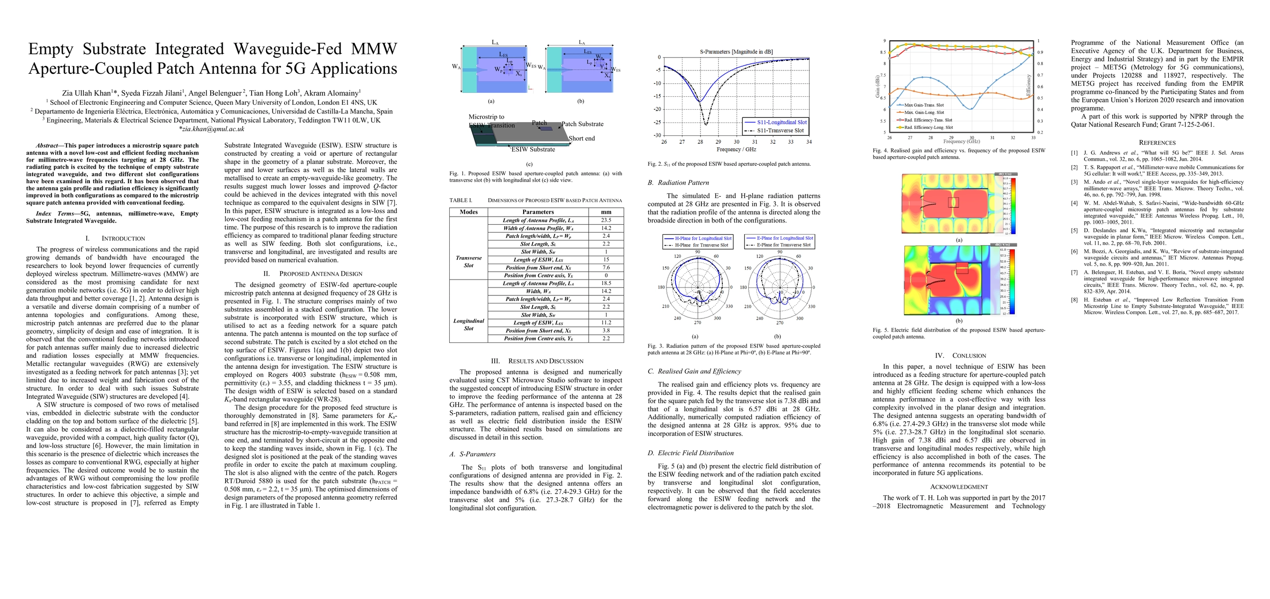 This paper presents a low-cost 28 GHz millimeter-wave patch antenna using an empty substrate integrated waveguide feeding mechanism, showing improved gain and efficiency compared to conventional feeding methods. Two slot configurations were explored, both yielding enhanced performance.