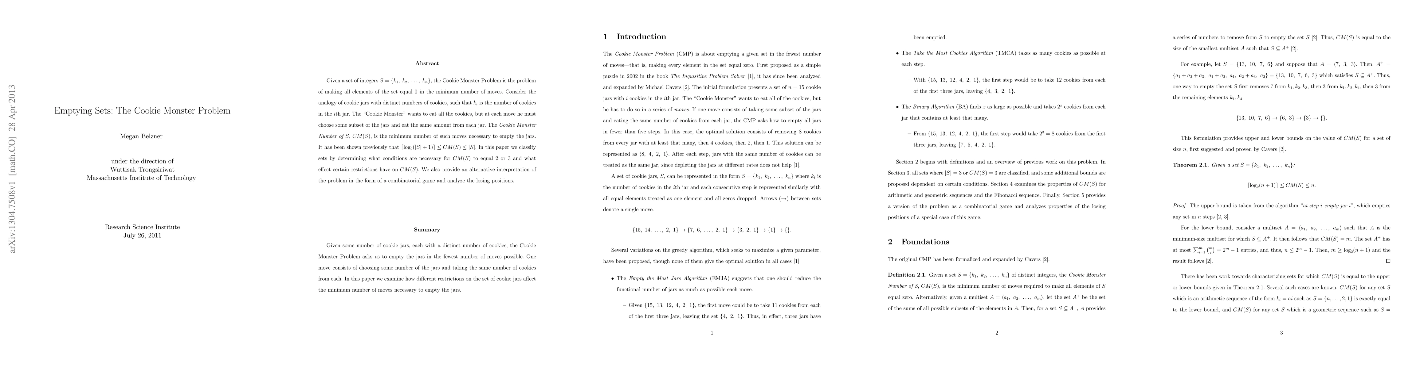 This paper investigates the Cookie Monster Problem, determining the minimum moves needed to empty a set of jars with distinct cookie counts by eating the same amount from each chosen jar. It classifies sets based on conditions for $CM(S)$ to equal 2 or 3 and analyzes losing positions in a combinatorial game interpretation.