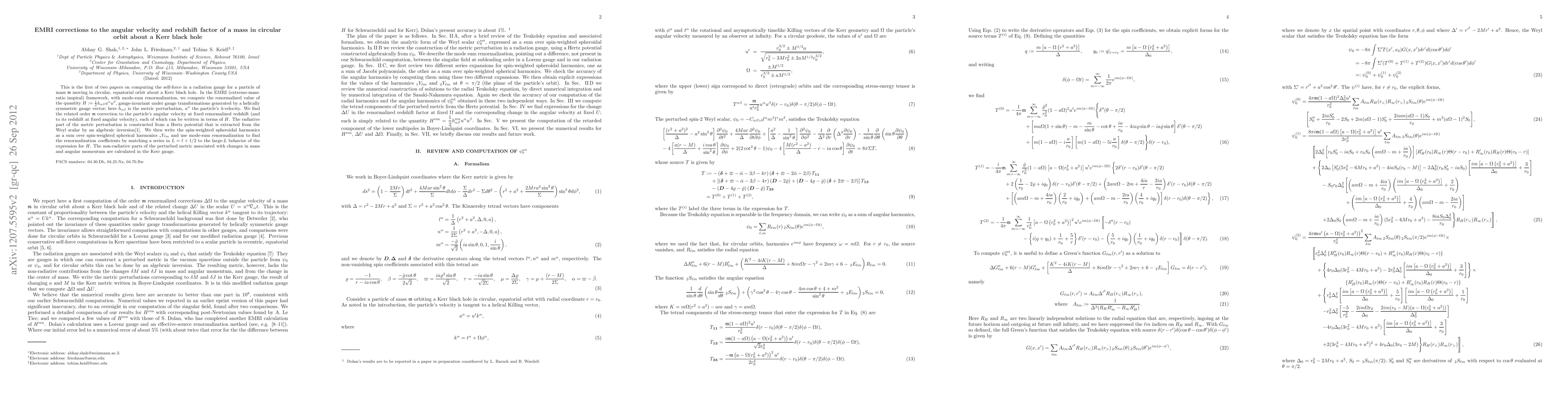 This is the first of two papers on computing the self-force in a radiation gauge for a particle moving in circular, equatorial orbit about a Kerr black hole. In the EMRI (extreme-mass-ratio inspiral) framework, with mode-sum renormalization, we compute the renormalized value of the quantity $h_{\alpha\beta}u^\alpha u^\beta$, gauge-invariant under gauge transformations generated by a helically symmetric gauge vector; and we find the related order $\frak{m}$ correction to the particle's angular velocity at fixed renormalized redshift (and to its redshift at fixed angular velocity). The radiative part of the perturbed metric is constructed from the Hertz potential which is extracted from the Weyl scalar by an algebraic inversion\cite{sf2}. We then write the spin-weighted spheroidal harmonics as a sum over spin-weighted spherical harmonics and use mode-sum renormalization to find the renormalization coefficients by matching a series in $L=\ell+1/2$ to the large-$L$ behavior of the expression for $H := \frac12 h_{\alpha\beta}u^\alpha u^\beta $. The non-radiative parts of the perturbed metric associated with changes in mass and angular momentum are calculated in the Kerr gauge.