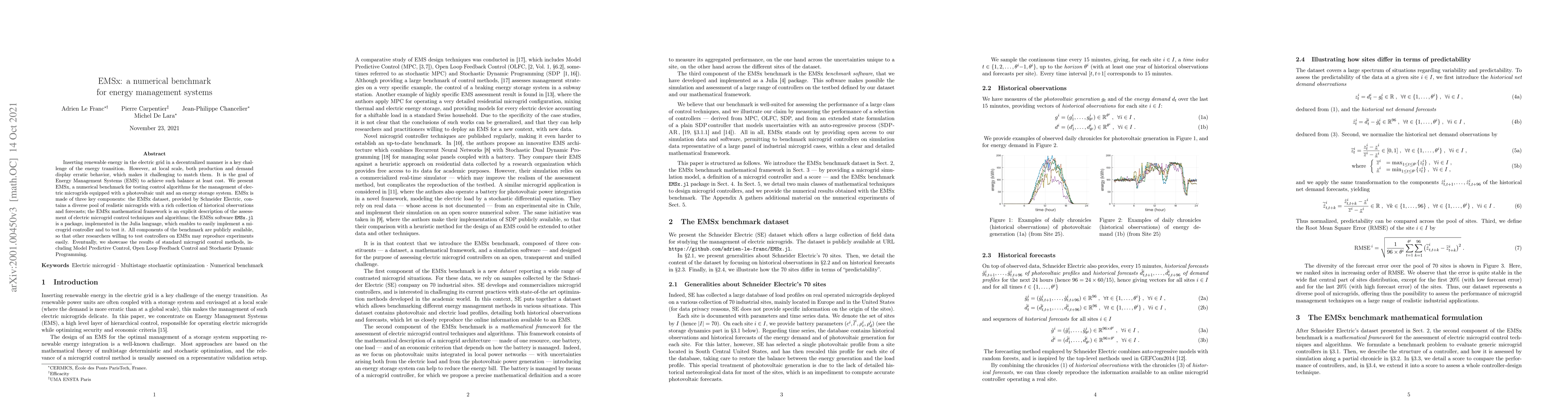 Inserting renewable energy in the electric grid in a decentralized manneris a key challenge of the energy transition. However, at local scale, both production and demand display erratic behavior, which makes it delicate to match them. It is the goal of Energy Management Systems (EMS) to achieve such balance at least cost. We present EMSx, a numerical benchmark for testing control algorithms for the management of electric microgrids equipped with a photovoltaic unit and an energy storage system. EMSx is made of three key components: the EMSx dataset, provided by Schneider Electric, contains a diverse pool of realistic microgrids with a rich collection of historical observations and forecasts; the EMSx mathematical framework is an explicit description of the assessment of electric microgrid control techniques and algorithms; the EMSx software EMSx.jl is a package, implemented in the Julia language, which enables to easily implement a microgrid controller and to test it. All components of the benchmark are publicly available, so that other researchers willing to test controllers on EMSx may reproduce experiments easily. Eventually, we showcase the results of standard microgrid control methods, including Model Predictive Control, Open Loop Feedback Control and Stochastic Dynamic Programming.