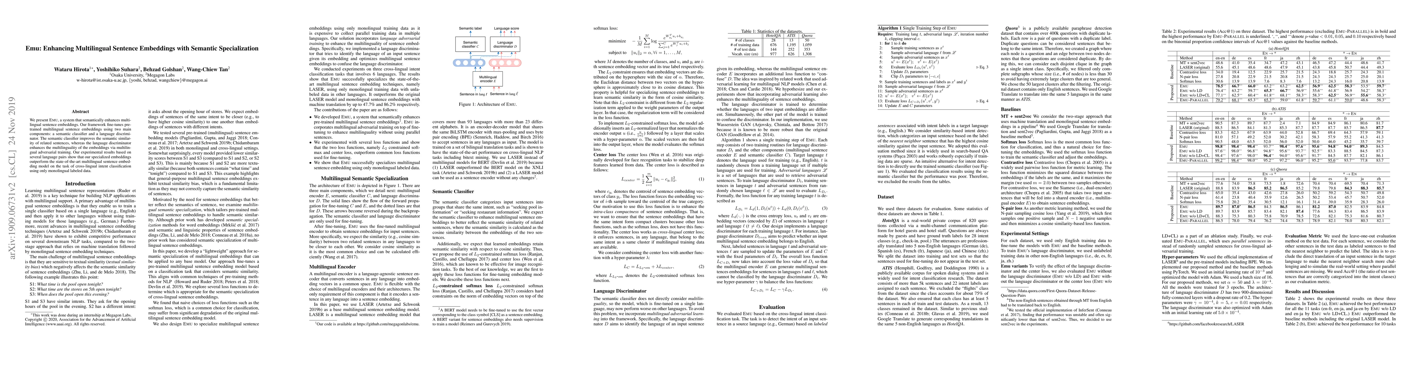 Summary: Emu improves multilingual sentence embeddings through fine-tuning with a semantic classifier and a language discriminator, achieving superior performance in cross-lingual intent classification compared to existing models.