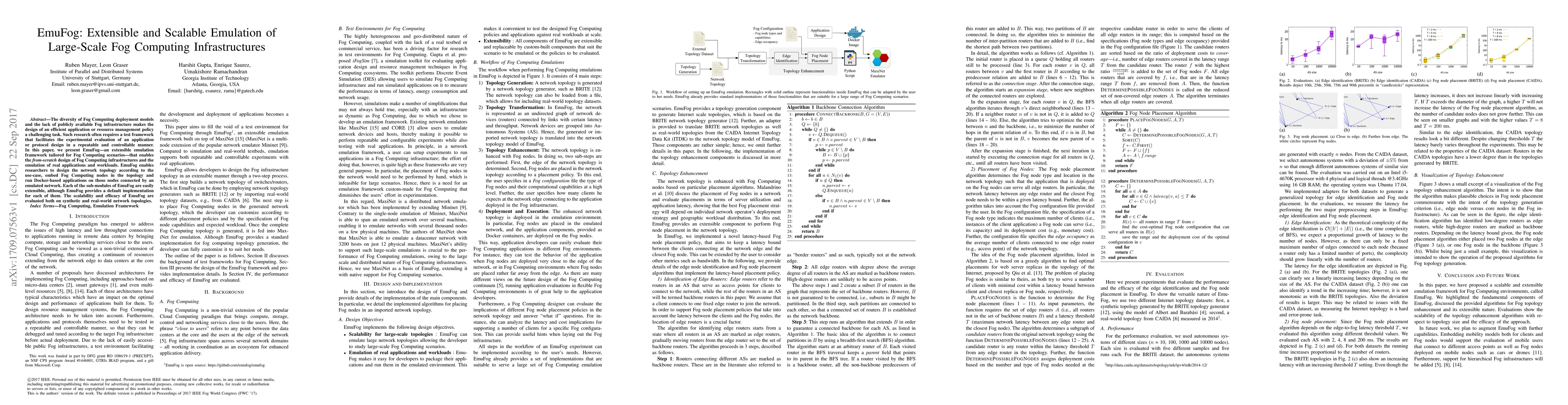 EmuFog is an extensible emulation framework designed for testing Fog Computing applications and policies. It allows researchers to create scalable Fog Computing infrastructures and emulate real workloads, facilitating the design of network topologies and Docker-based applications.