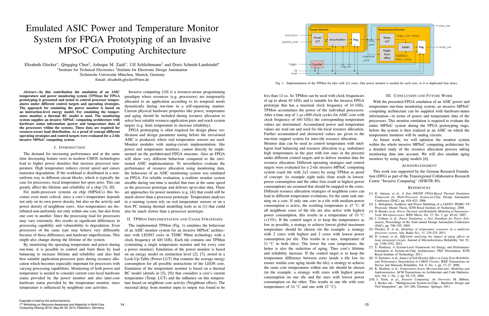 In this contribution the emulation of an ASIC temperature and power monitoring system (TPMon) for FPGA prototyping is presented and tested to control processor temperatures under different control targets and operating strategies. The approach for emulating the power monitor is based on an instruction-level energy model. For emulating the temperature monitor, a thermal RC model is used. The monitoring system supplies an invasive MPSoC computing architecture with hardware status information (power and temperature data of the processors within the system). These data are required for resource-aware load distribution. As a proof of concept different operating strategies and control targets were evaluated for a 2-tile invasive MPSoC computing system.