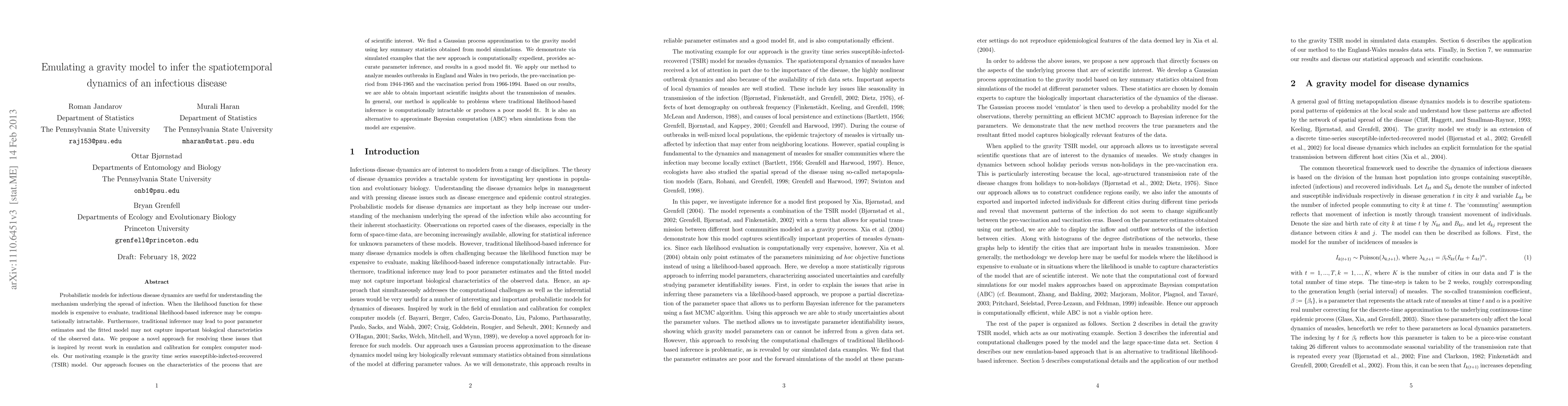 Probabilistic models for infectious disease dynamics are useful for understanding the mechanism underlying the spread of infection. When the likelihood function for these models is expensive to evaluate, traditional likelihood-based inference may be computationally intractable. Furthermore, traditional inference may lead to poor parameter estimates and the fitted model may not capture important biological characteristics of the observed data. We propose a novel approach for resolving these issues that is inspired by recent work in emulation and calibration for complex computer models. Our motivating example is the gravity time series susceptible-infected-recovered (TSIR) model. Our approach focuses on the characteristics of the process that are of scientific interest. We find a Gaussian process approximation to the gravity model using key summary statistics obtained from model simulations. We demonstrate via simulated examples that the new approach is computationally expedient, provides accurate parameter inference, and results in a good model fit. We apply our method to analyze measles outbreaks in England and Wales in two periods, the pre-vaccination period from 1944-1965 and the vaccination period from 1966-1994. Based on our results, we are able to obtain important scientific insights about the transmission of measles. In general, our method is applicable to problems where traditional likelihood-based inference is computationally intractable or produces a poor model fit. It is also an alternative to approximate Bayesian computation (ABC) when simulations from the model are expensive.