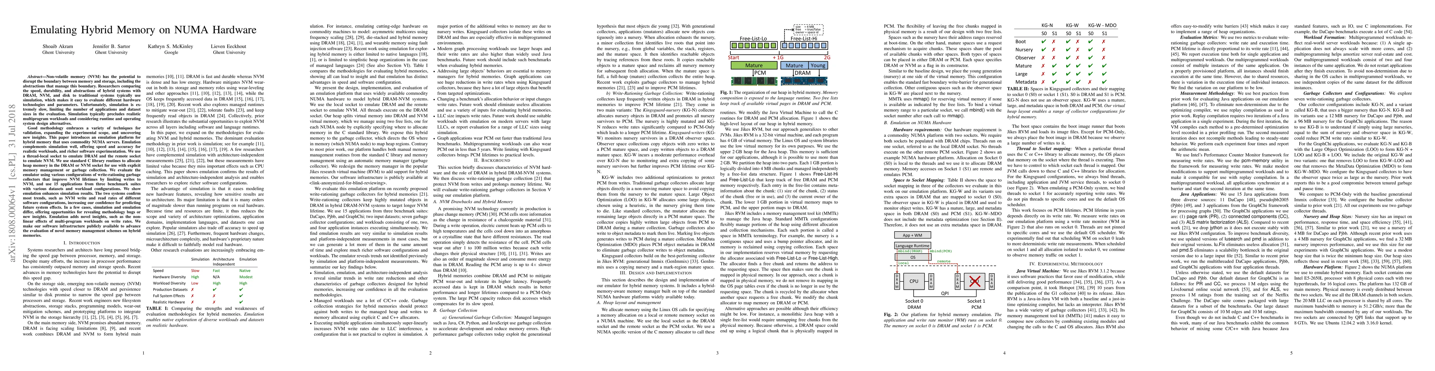 This paper introduces an emulation platform for hybrid memory systems using commodity NUMA servers to complement slow simulations. The platform emulates DRAM and NVM, enabling faster and more realistic multi-program workload evaluations, and provides insights into non-linear effects of such workloads on write rates.