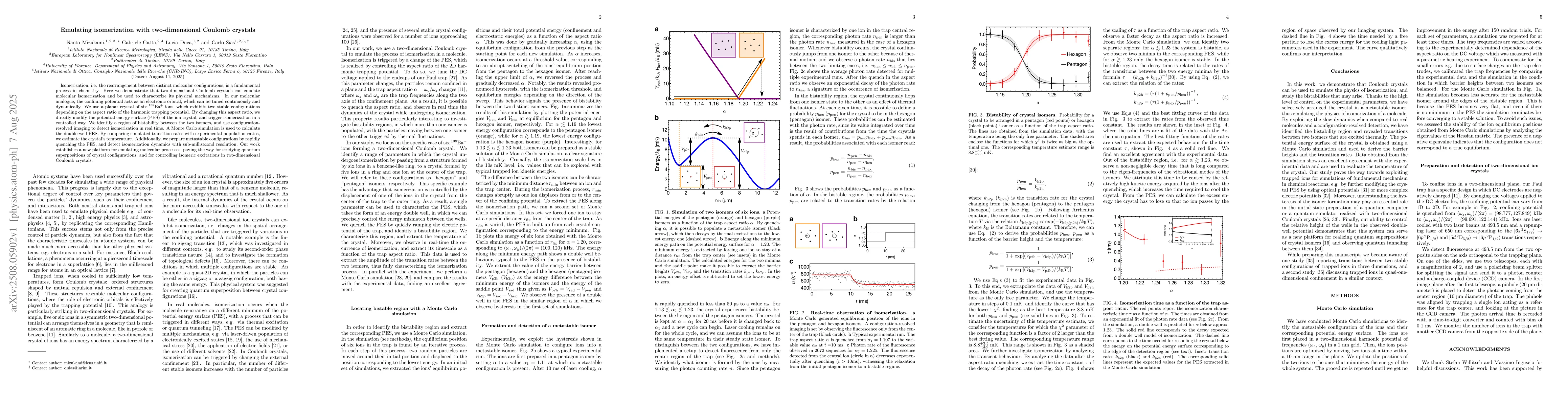 Isomerization, i.e. the rearrangement between distinct molecular configurations, is a fundamental process in chemistry. Here we demonstrate that two-dimensional Coulomb crystals can emulate molecular isomerization and be used to characterize its physical mechanisms. In our molecular analogue, the confining potential acts as an electronic orbital, which can be tuned continuously and dynamically. We use a planar crystal of six 138Ba+ ions, which exhibits two stable configurations depending on the aspect ratio of the harmonic trapping potential. By changing this aspect ratio, we directly modify the potential energy surface (PES) of the ion crystal, and trigger isomerization in a controlled way. We identify a region of bistability between the two isomers, and use configuration-resolved imaging to detect isomerization in real time. A Monte Carlo simulation is used to calculate the double well PES. By comparing simulated transition rates with experimental population ratios, we estimate the crystal's temperature. Additionally, we prepare metastable configurations by rapidly quenching the PES, and detect isomerization dynamics with sub-millisecond resolution. Our work establishes a new platform for emulating molecular processes, paving the way for studying quantum superpositions of crystal configurations, and for controlling isomeric excitations in two-dimensional Coulomb crystals.