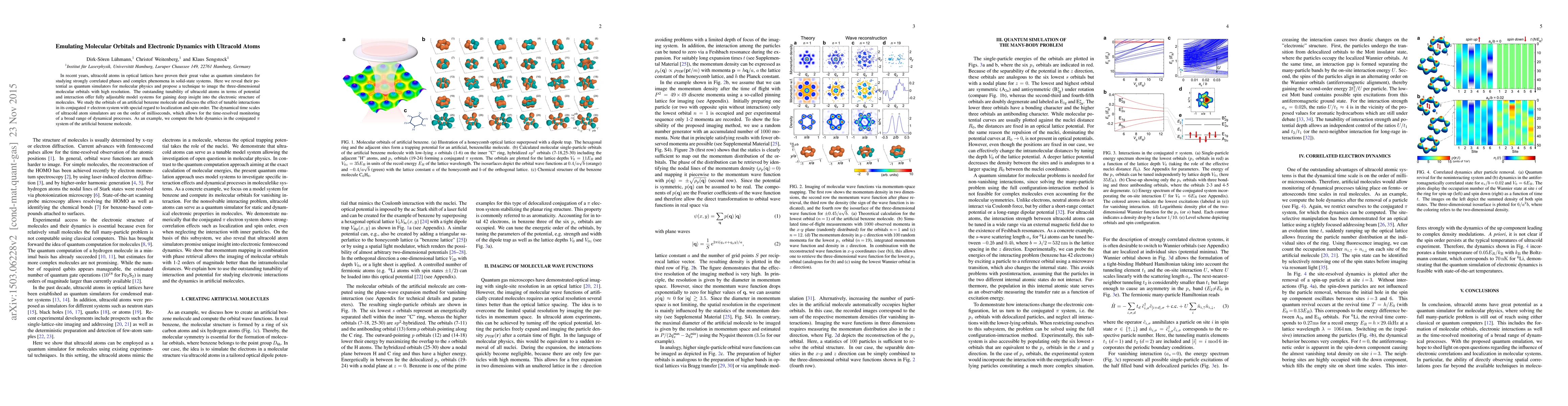 This paper explores ultracold atoms in optical lattices as quantum simulators for molecular physics, proposing a method to image high-resolution three-dimensional molecular orbitals. It studies the electronic structure of an artificial benzene molecule, focusing on tunable interactions and their effects on pi electron system dynamics, including localization and spin order, and demonstrates the capability to monitor hole dynamics in real-time.