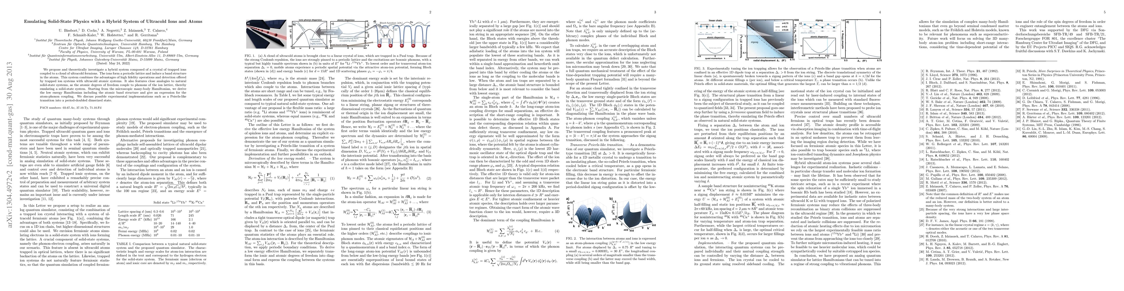 This paper proposes a hybrid system of ultracold ions and fermions to emulate solid-state physics, combining the scalability and tunability of atomic systems with the precision of ion traps. The theoretical investigation includes deriving a low-energy Hamiltonian and discussing potential experimental implementations, such as a Peierls-like transition.