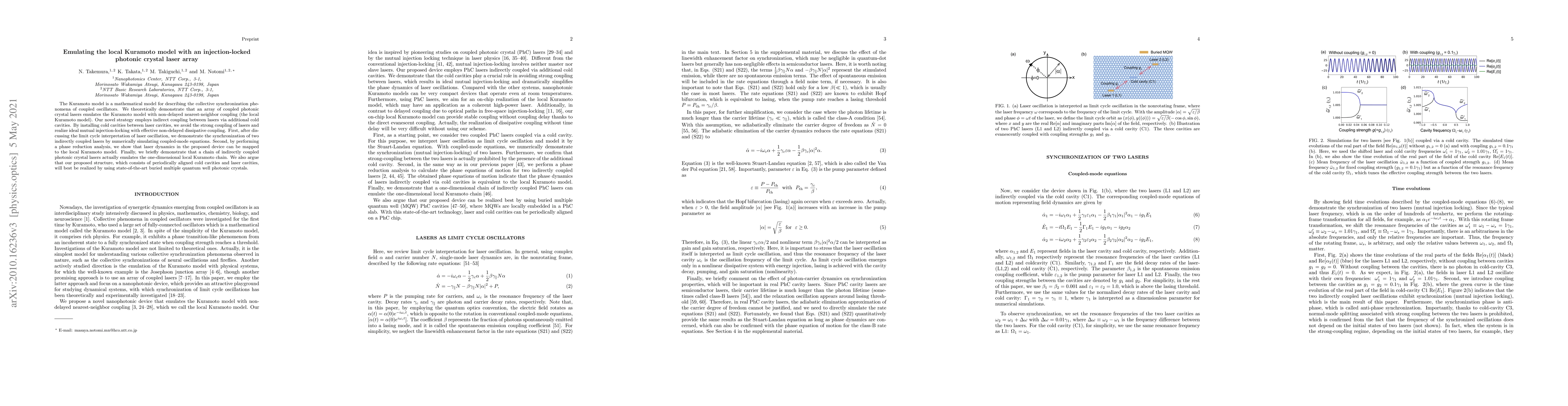 This paper demonstrates that an array of coupled photonic crystal lasers can emulate the local Kuramoto model through indirect coupling via cold cavities, achieving non-delayed synchronization. The proposed structure, realized using buried multiple quantum well photonic crystals, shows promising potential for modeling collective synchronization phenomena.