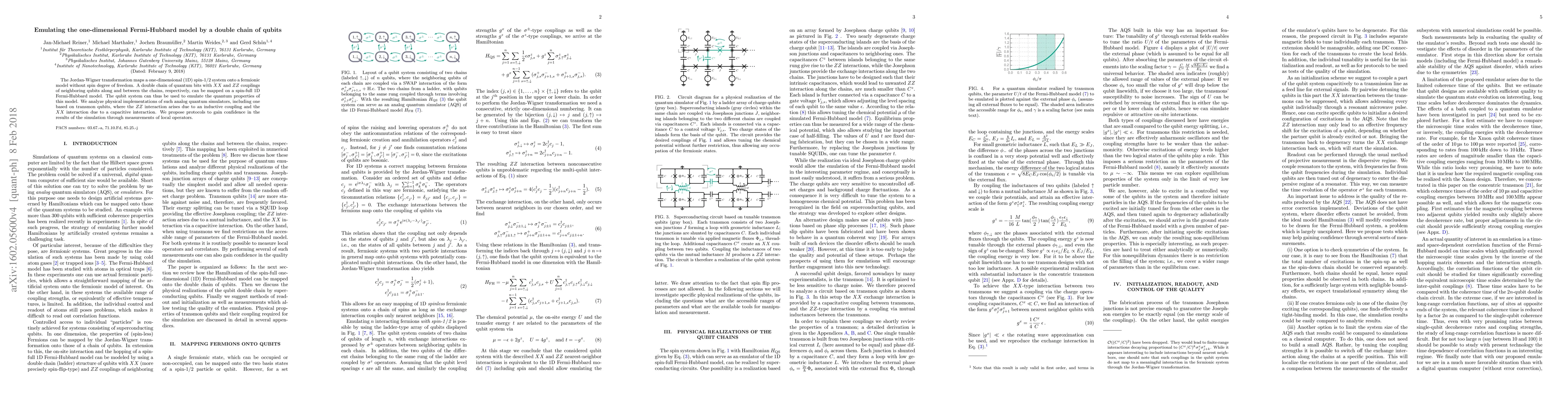 The Jordan-Wigner transformation maps a one-dimensional spin-1/2 system onto a fermionic model without spin degree of freedom. A double chain of quantum bits with XX and ZZ couplings of neighboring qubits along and between the chains, respectively, can be mapped on a spin-full 1D Fermi-Hubbard model. The qubit system can thus be used to emulate the quantum properties of this model. We analyze physical implementations of such analog quantum simulators, including one based on transmon qubits, where the ZZ interaction arises due to an inductive coupling and the XX interaction due to a capacitive interaction. We propose protocols to gain confidence in the results of the simulation through measurements of local operators.