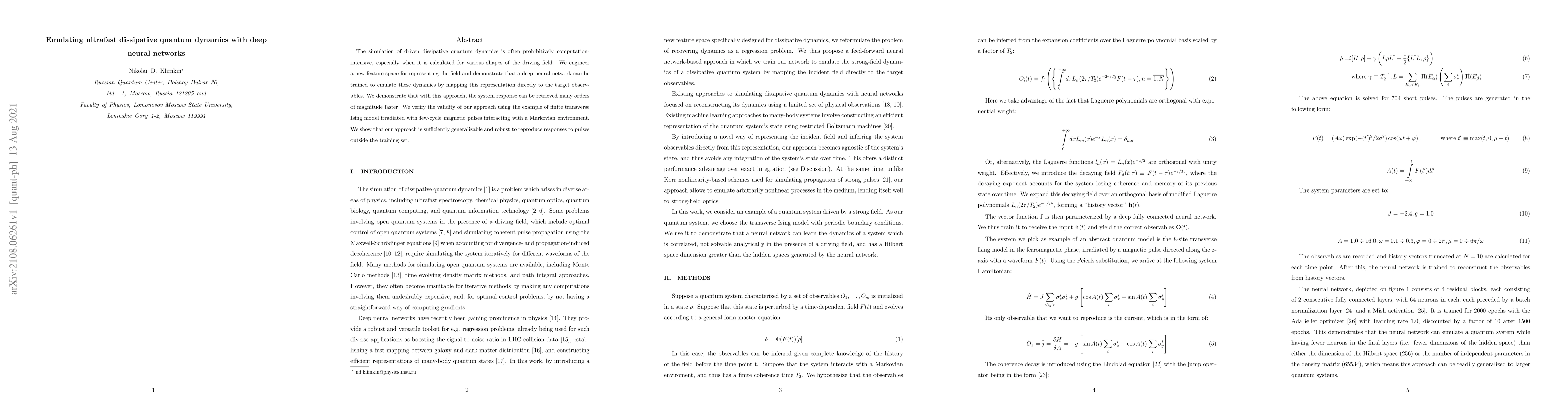 This paper proposes using deep neural networks to efficiently simulate ultrafast dissipative quantum dynamics, significantly speeding up computations compared to traditional methods. The authors demonstrate the effectiveness of their approach by training a neural network on the finite transverse Ising model under various magnetic pulses, showing it can generalize to new, unseen pulses.