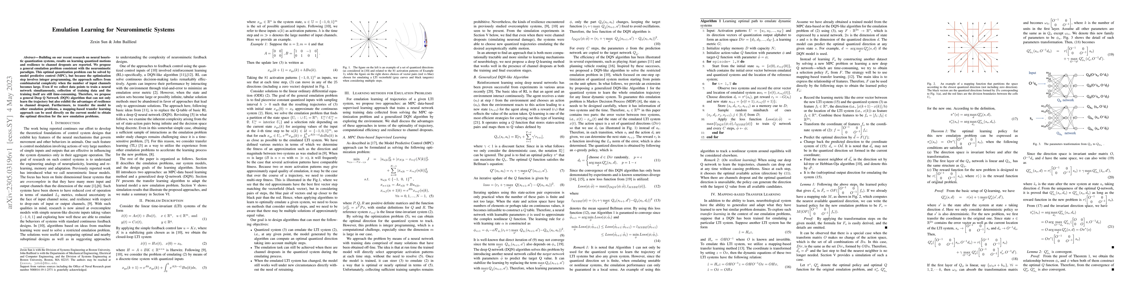 This paper proposes a Deep Q Network (DQN) algorithm for learning quantized motions in neuromimetic systems, addressing the combinatorial complexity of model predictive control. It also introduces a transfer learning approach for adapting the model to new emulation problems.