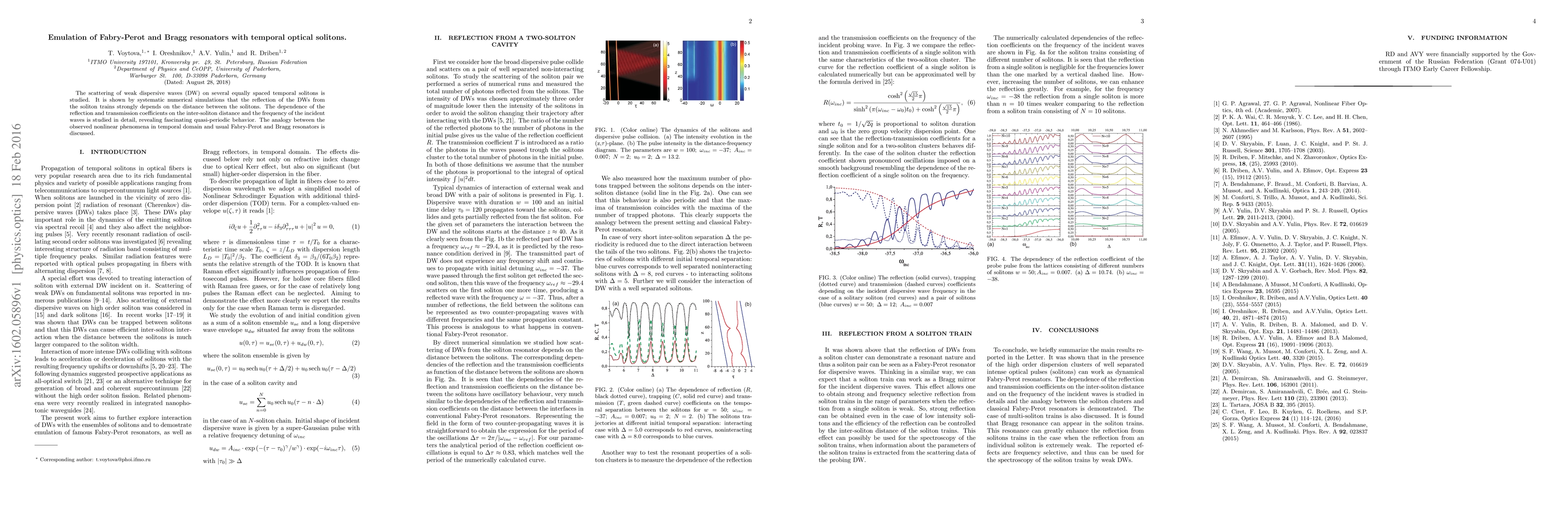 The scattering of weak dispersive waves (DW) on several equally spaced temporal solitons is studied. It is shown by systematic numerical simulations that the reflection of the DWs from the soliton trains strongly depends on the distance between the solitons. The dependence of the reflection and transmission coefficients on the inter-soliton distance and the frequency of the incident waves is studied in detail, revealing fascinating quasi-periodic behavior. The analogy between the observed nonlinear phenomena in temporal domain and usual Fabry-Perot and Bragg resonators is discussed.