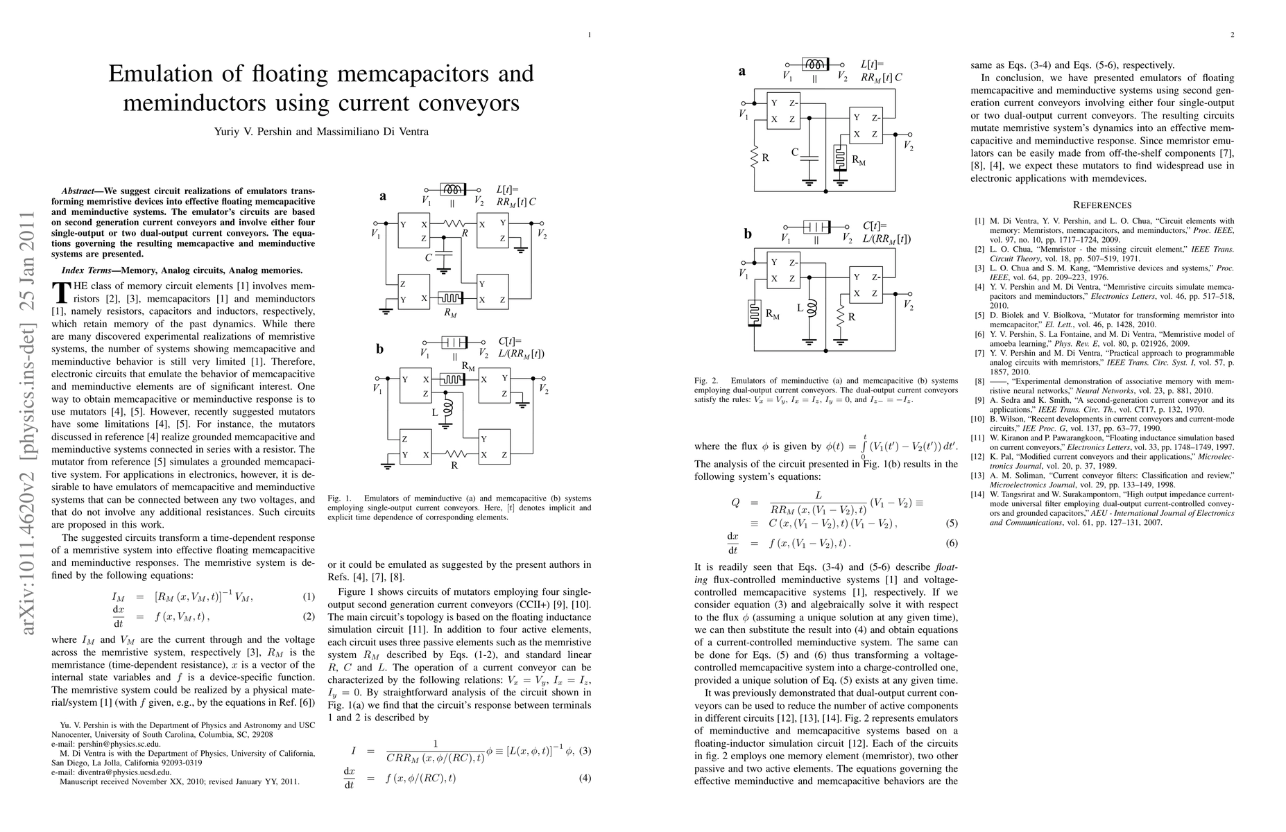 The research proposes circuit realizations using second-generation current conveyors to transform memristive devices into effective floating memcapacitive and meminductive systems, involving either four single-output or two dual-output current conveyors.