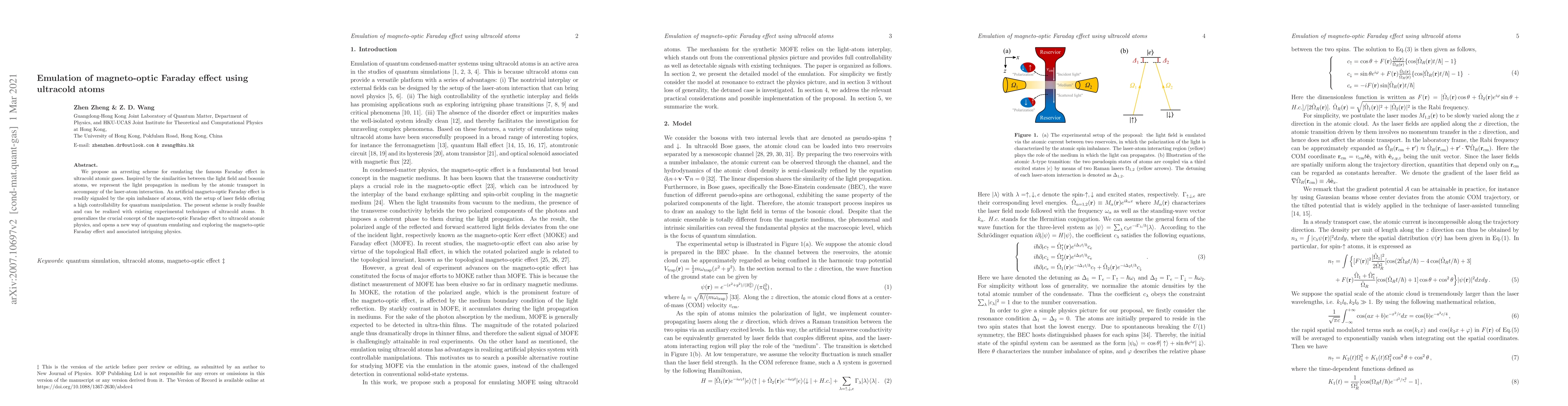 This paper proposes a method to emulate the magneto-optic Faraday effect using ultracold atomic gases, where light propagation is represented by atomic transport influenced by laser fields. The scheme allows for high controllability in quantum manipulation and is feasible with current experimental techniques.