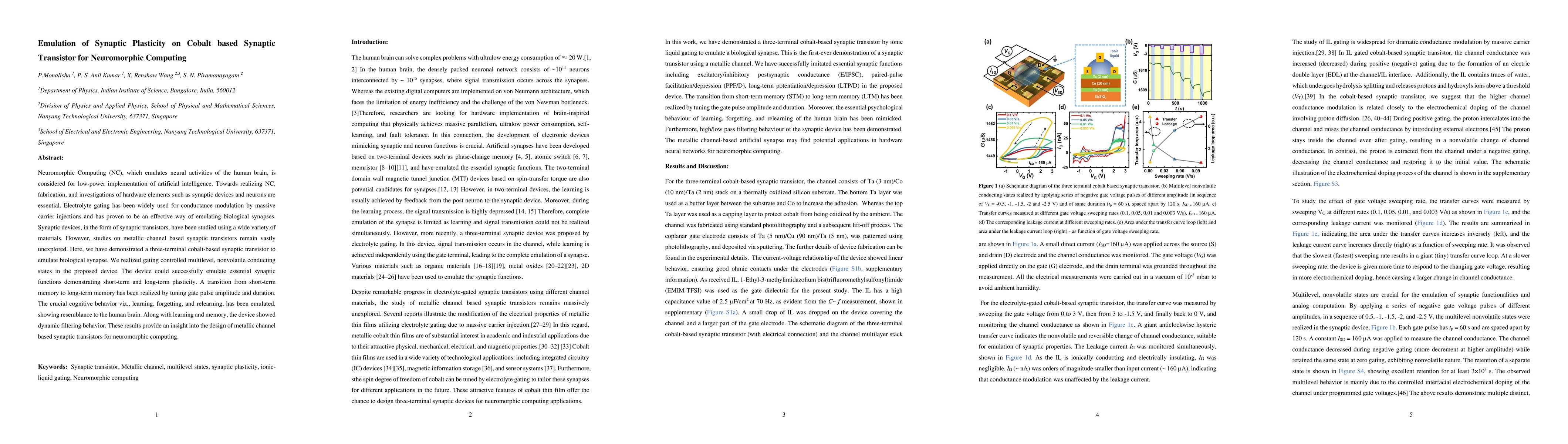 This paper demonstrates a cobalt-based synaptic transistor emulating biological synaptic plasticity for neuromorphic computing, achieving gating-controlled multilevel, nonvolatile conducting states and emulating short-term and long-term plasticity, along with learning, forgetting, and relearning behaviors. The study provides insights into metallic channel-based synaptic transistors for low-power artificial intelligence applications.