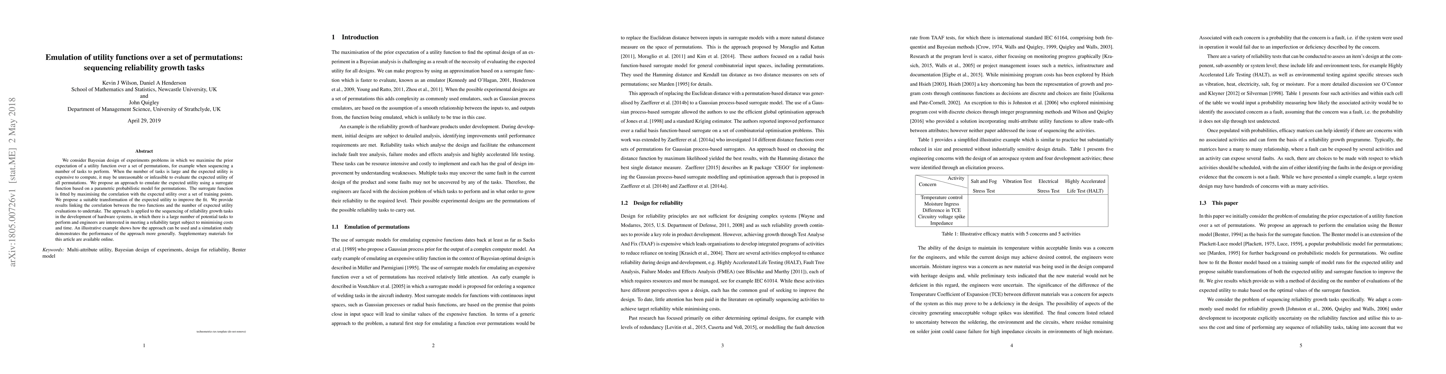 We consider Bayesian design of experiments problems in which we maximise the prior expectation of a utility function over a set of permutations, for example when sequencing a number of tasks to perform. When the number of tasks is large and the expected utility is expensive to compute, it may be unreasonable or infeasible to evaluate the expected utility of all permutations. We propose an approach to emulate the expected utility using a surrogate function based on a parametric probabilistic model for permutations. The surrogate function is fitted by maximising the correlation with the expected utility over a set of training points. We propose a suitable transformation of the expected utility to improve the fit. We provide results linking the correlation between the two functions and the number of expected utility evaluations to undertake. The approach is applied to the sequencing of reliability growth tasks in the development of hardware systems, in which there is a large number of potential tasks to perform and engineers are interested in meeting a reliability target subject to minimising costs and time. An illustrative example shows how the approach can be used and a simulation study demonstrates the performance of the approach more generally.