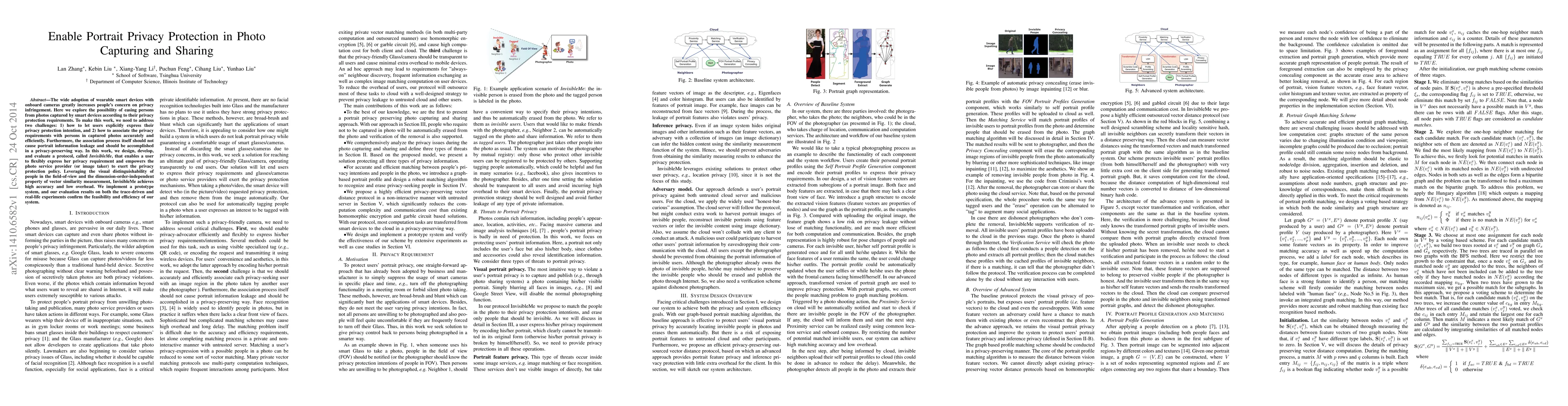 The wide adoption of wearable smart devices with onboard cameras greatly increases people's concern on privacy infringement. Here we explore the possibility of easing persons from photos captured by smart devices according to their privacy protection requirements. To make this work, we need to address two challenges: 1) how to let users explicitly express their privacy protection intention, and 2) how to associate the privacy requirements with persons in captured photos accurately and efficiently. Furthermore, the association process itself should not cause portrait information leakage and should be accomplished in a privacy-preserving way. In this work, we design, develop, and evaluate a protocol, that enables a user to flexibly express her privacy requirement and empowers the photo service provider (or image taker) to exert the privacy protection policy.Leveraging the visual distinguishability of people in the field-of-view and the dimension-order-independent property of vector similarity measurement, we achieves high accuracy and low overhead. We implement a prototype system, and our evaluation results on both the trace-driven and real-life experiments confirm the feasibility and efficiency of our system.