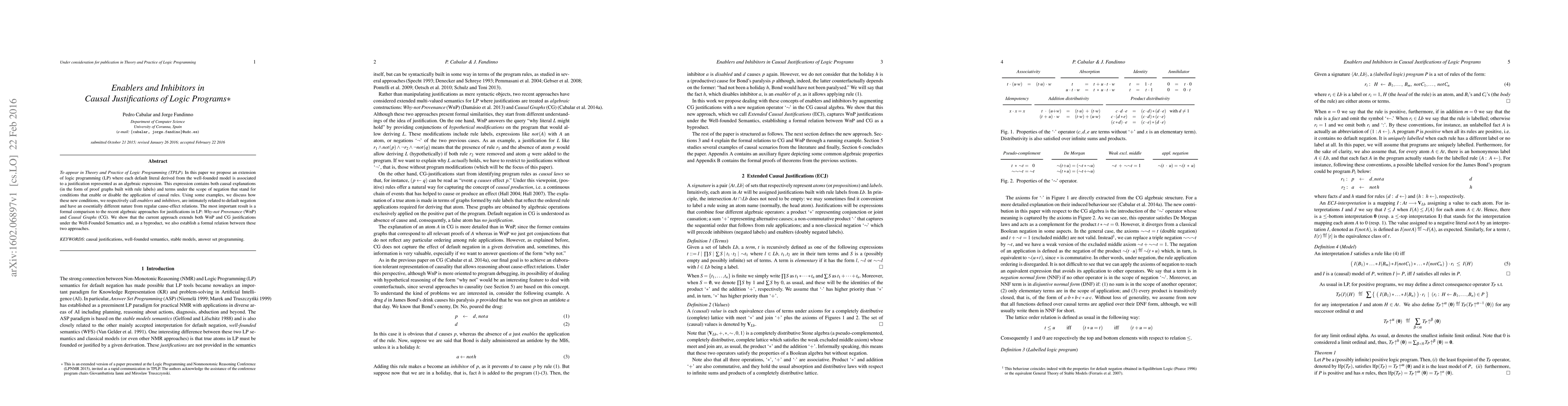 To appear in Theory and Practice of Logic Programming (TPLP). In this paper we propose an extension of logic programming (LP) where each default literal derived from the well-founded model is associated to a justification represented as an algebraic expression. This expression contains both causal explanations (in the form of proof graphs built with rule labels) and terms under the scope of negation that stand for conditions that enable or disable the application of causal rules. Using some examples, we discuss how these new conditions, we respectively call "enablers" and "inhibitors", are intimately related to default negation and have an essentially different nature from regular cause-effect relations. The most important result is a formal comparison to the recent algebraic approaches for justifications in LP: "Why-not Provenance" (WnP) and "Causal Graphs" (CG). We show that the current approach extends both WnP and CG justifications under the Well-Founded Semantics and, as a byproduct, we also establish a formal relation between these two approaches.