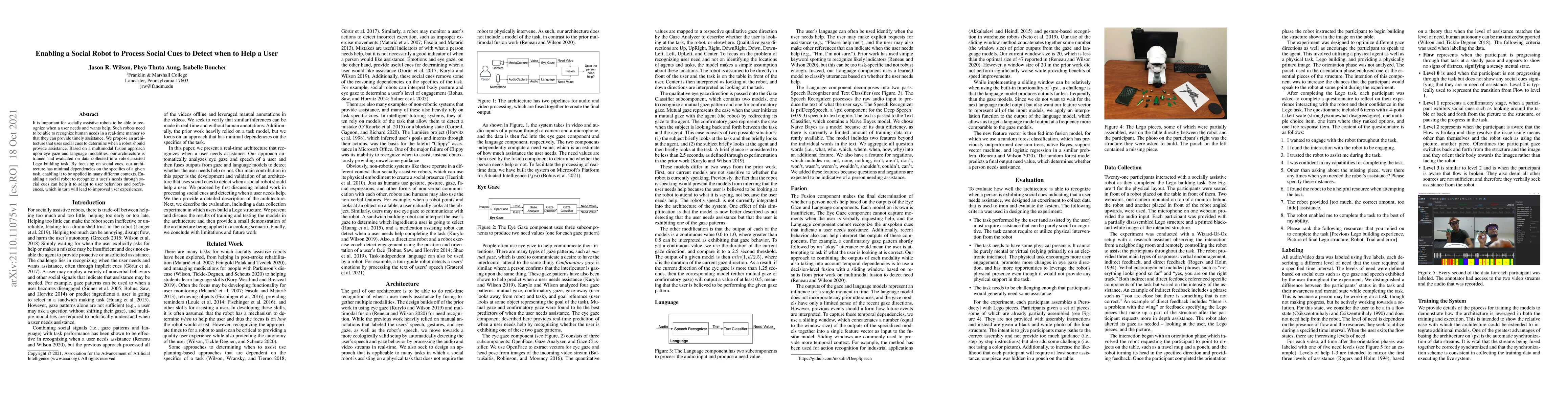 This paper proposes an architecture for socially assistive robots to detect when to provide help by recognizing social cues, specifically through eye gaze and language modalities. The architecture is evaluated in a Lego building task, demonstrating its adaptability to various contexts and improving user experiences through better user-robot interaction.