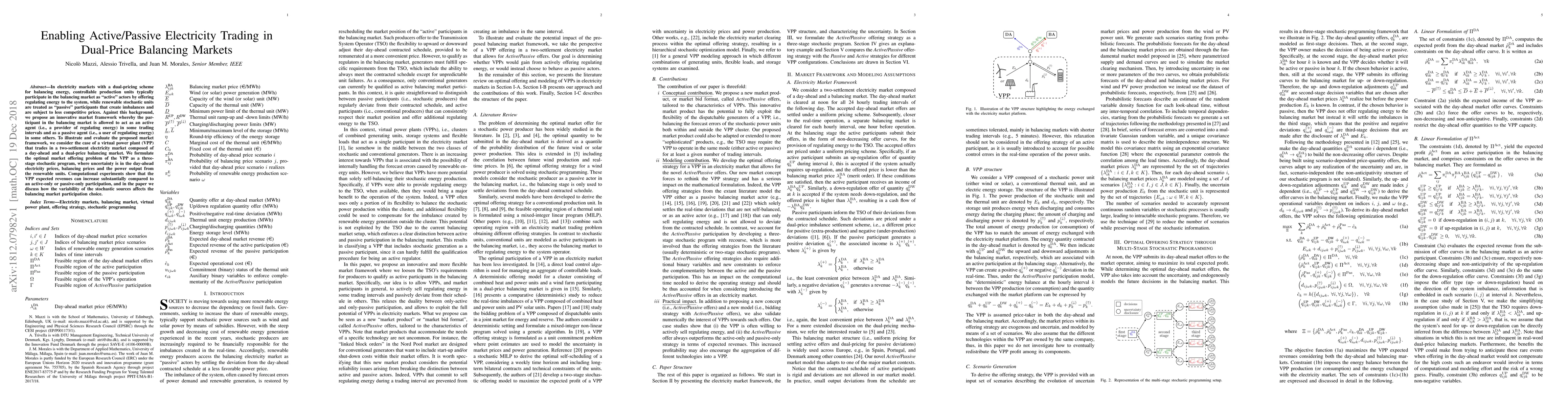 In electricity markets with a dual-pricing scheme for balancing energy, controllable production units typically participate in the balancing market as "active" actors by offering regulating energy to the system, while renewable stochastic units are treated as "passive" participants that create imbalances and are subject to less competitive prices. Against this background, we propose an innovative market framework whereby the participant in the balancing market is allowed to act as an active agent (i.e., a provider of regulating energy) in some trading intervals and as a passive agent (i.e., a user of regulating energy) in some others. To illustrate and evaluate the proposed market framework, we consider the case of a virtual power plant (VPP) that trades in a two-settlement electricity market composed of a day-ahead and a dual-price balancing market. We formulate the optimal market offering problem of the VPP as a three-stage stochastic program, where uncertainty is in the day-ahead electricity prices, balancing prices and the power output from the renewable units. Computational experiments show that the VPP expected revenues can increase substantially compared to an active-only or passive-only participation, and in the paper we discuss how the variability of the stochastic sources affects the balancing market participation choice.