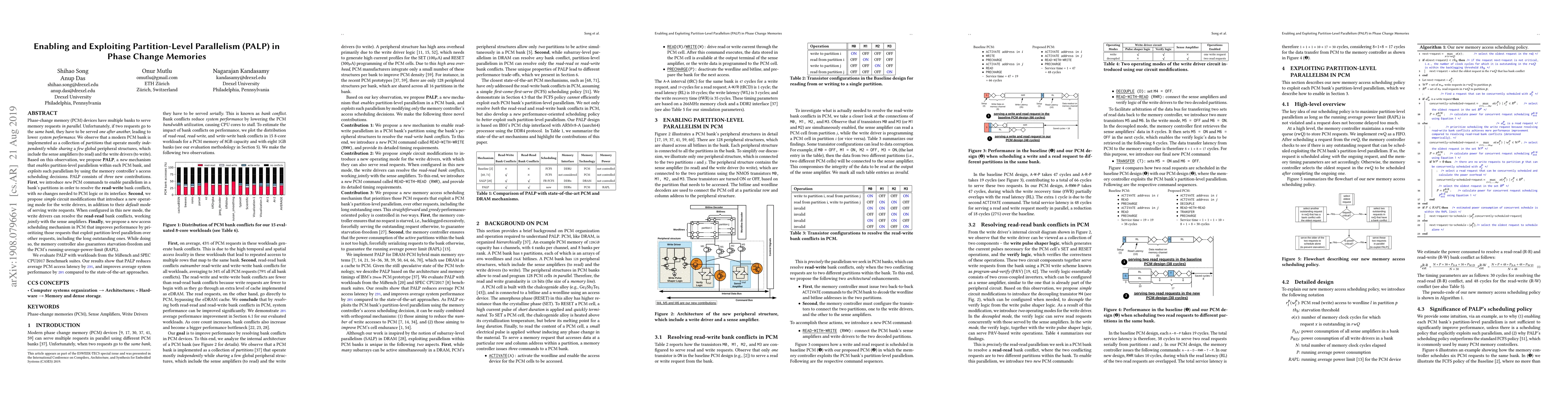 This paper proposes PALP, a mechanism to enable and exploit partition-level parallelism in phase-change memory (PCM) banks, addressing the issue of sequential access when multiple requests target the same bank. PALP introduces new PCM commands, circuit modifications, and an access scheduling mechanism to resolve conflicts and prioritize parallelizable requests, achieving a 23% reduction in PCM access latency and a 28% improvement in system performance.