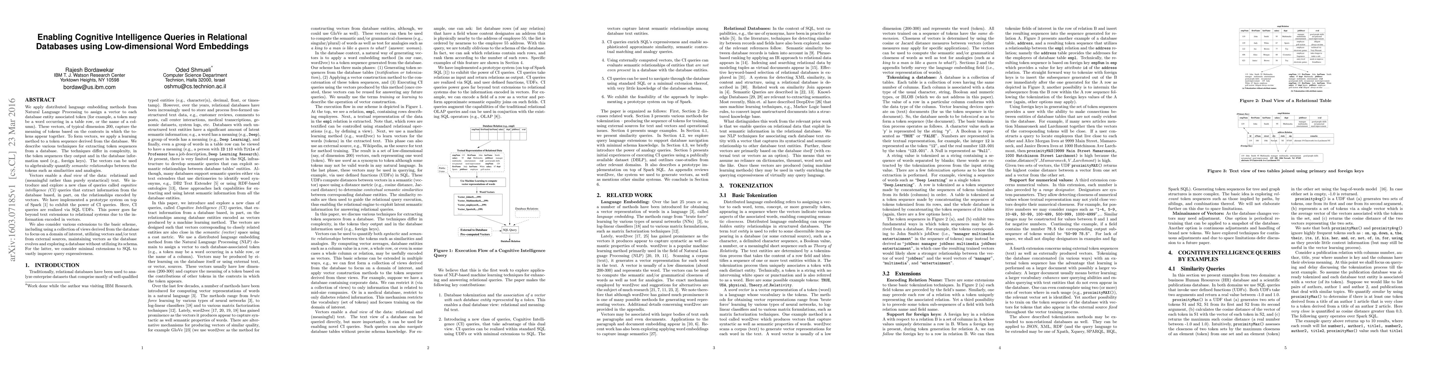 This paper explores the application of low-dimensional word embeddings to relational databases to enable cognitive intelligence queries. It introduces a method for generating vector representations of database entities based on context, enabling semantic relationships and a dual view of data. A prototype system demonstrates the potential of these cognitive intelligence queries, which go beyond traditional text extensions by leveraging encoded information in vectors.